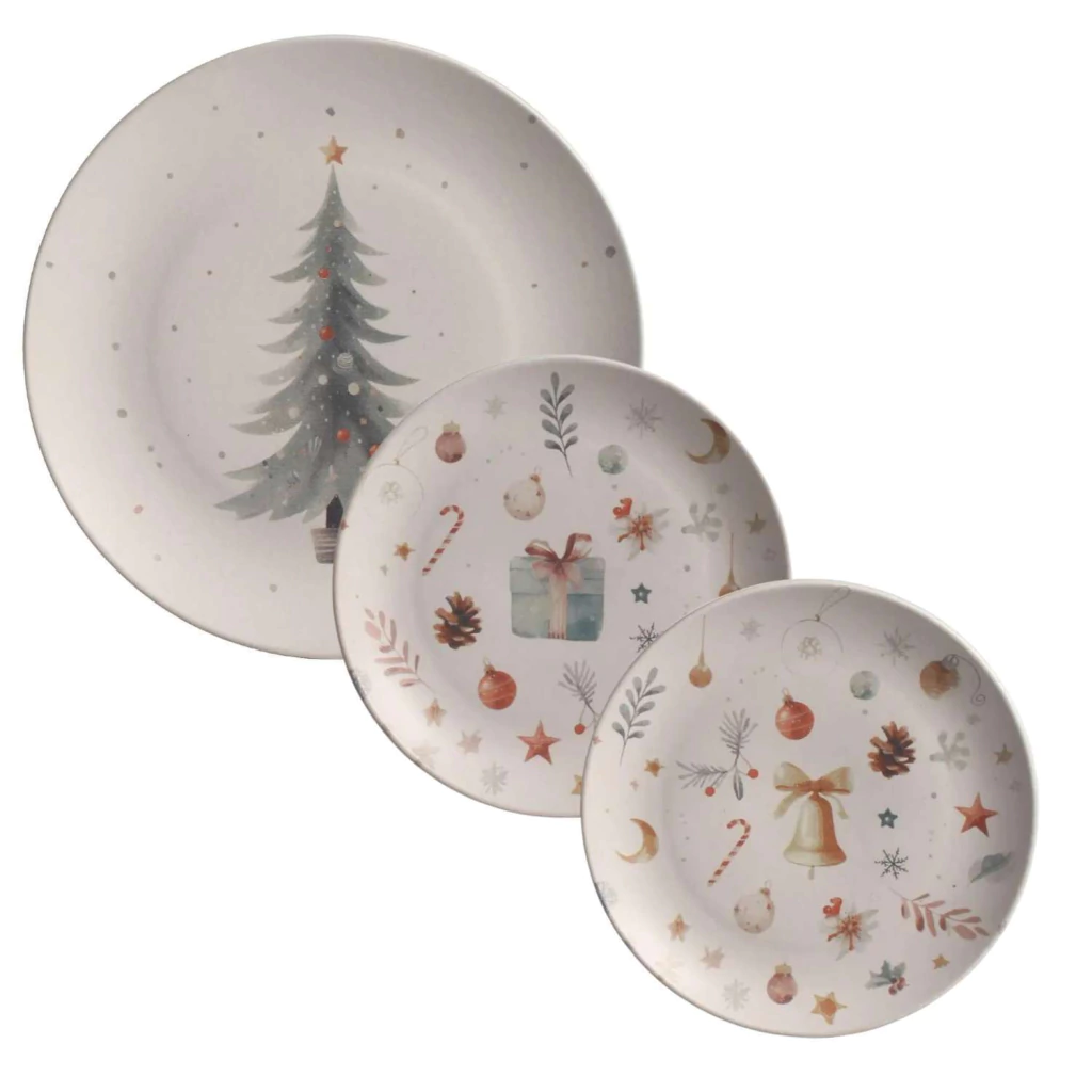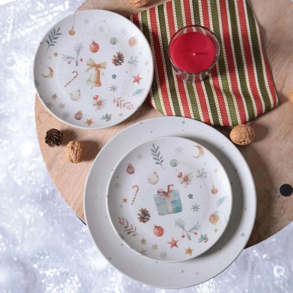 CONJUNTO 16 PRATOS 8 RASOS 8 SOBREMESA NOITE DE NATAL (4 SOB. SINO/ 4 SOB. PRESENTE) PORTO BRASIL