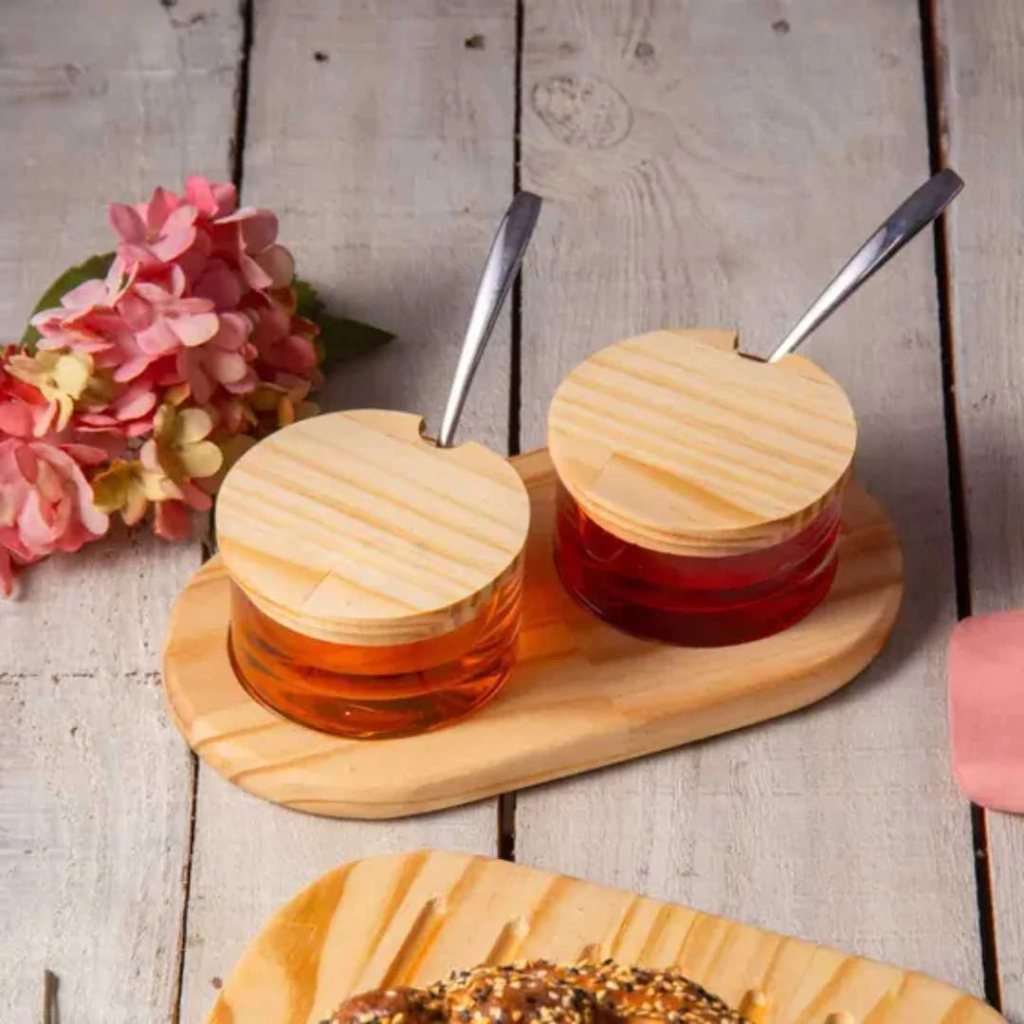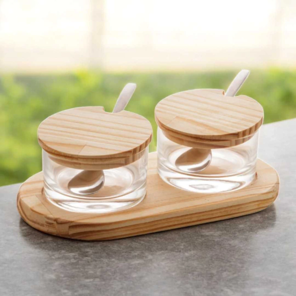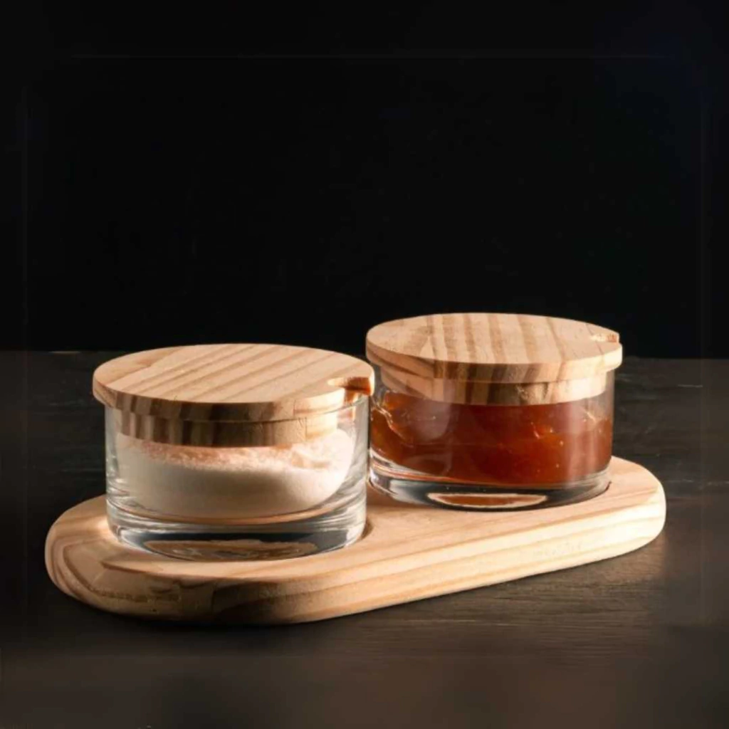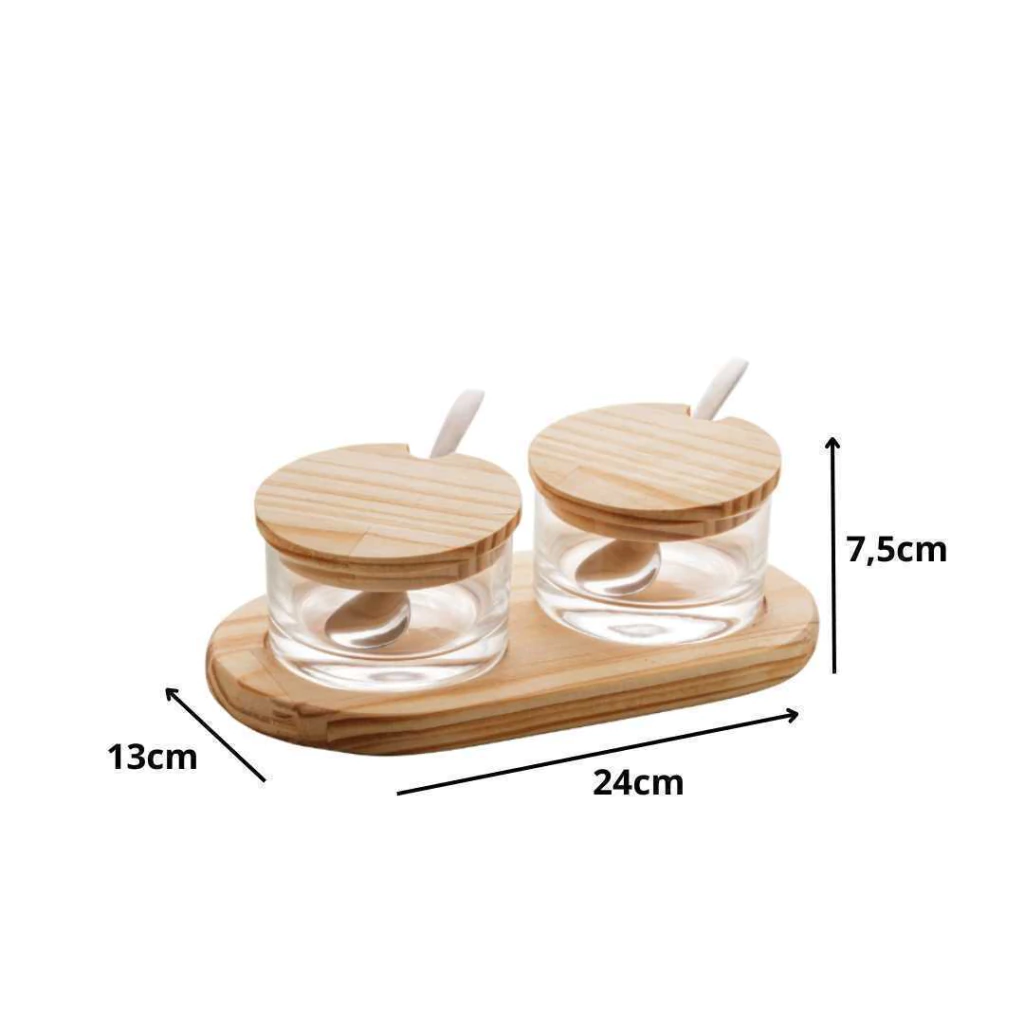 Composto por dois açucareiros de vidro, este conjunto oferece uma maneira elegante de servir diferentes tipos de açúcar, adoçantes ou até mesmo especiarias. O suporte de madeira pinus mantém os açucareiros organizados e acessíveis.