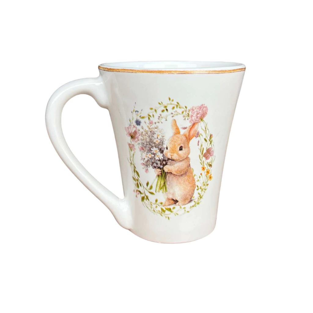 A Caneca Estampa Coelho Buquê Scalla encanta com seu design delicado e tema de Páscoa. Apresenta ilustração de um coelho com flores em tons suaves, transmitindo leveza e aconchego. Ideal para presentear ou compor uma mesa posta charmosa e alegre.