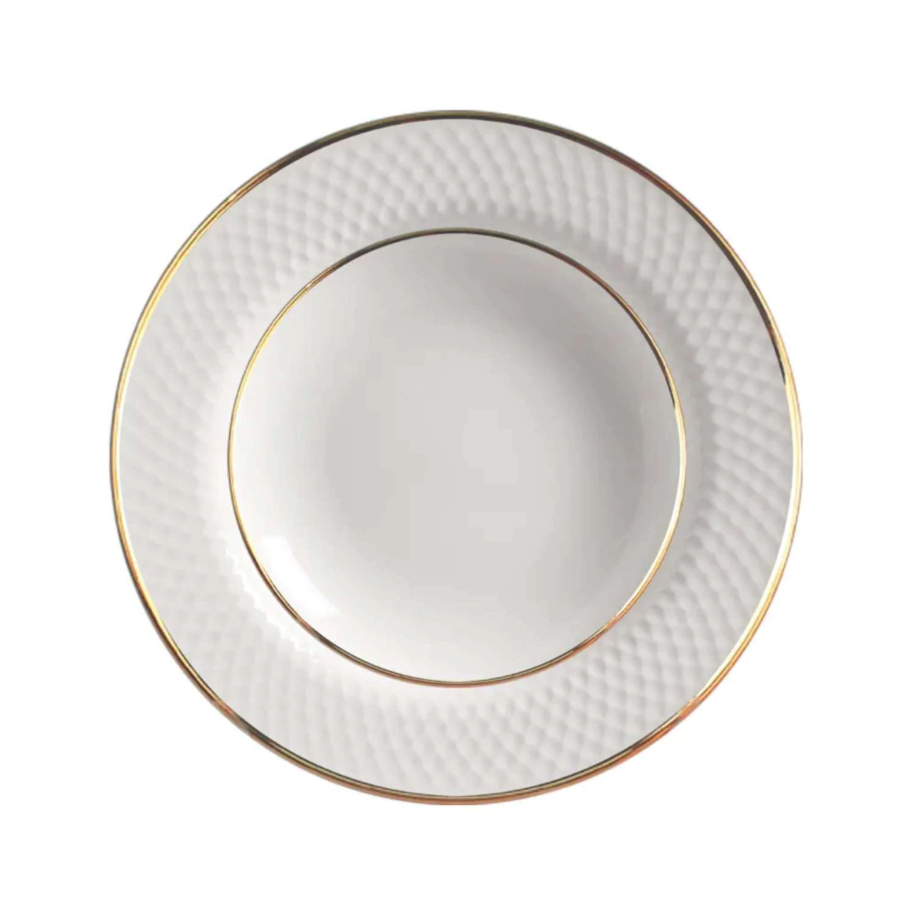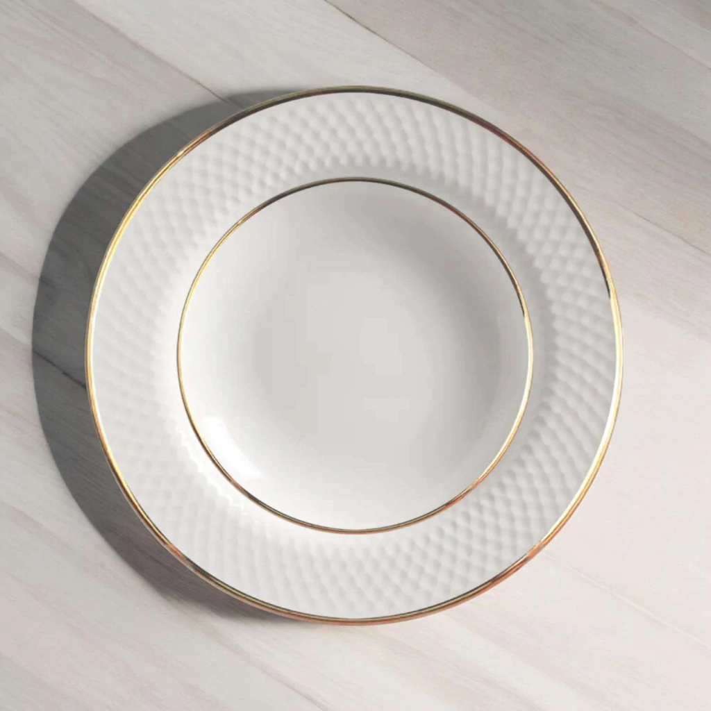 Borda texturizada em faixas com acabamento dourado metalizado, trazendo brilho moderno sem estampas centrais.