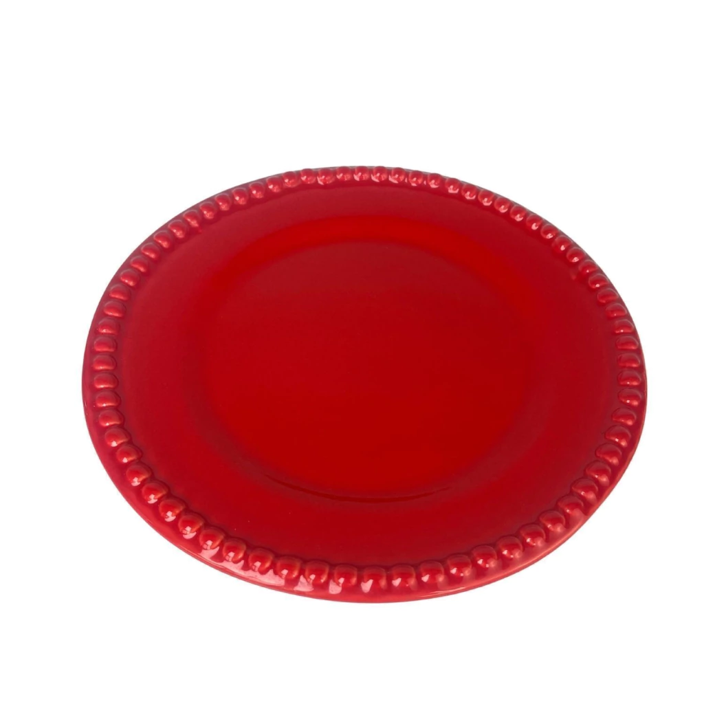 Conjunto com 6 pratos rasos vermelhos, com delicadas bolinhas em relevo nas bordas. Um modelo encantador que combina charme e elegância na mesa. Ideal para composições natalinas ou ocasiões especiais.