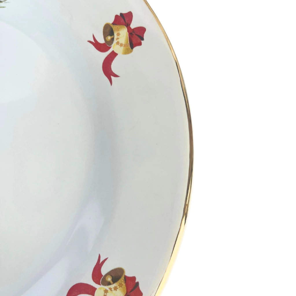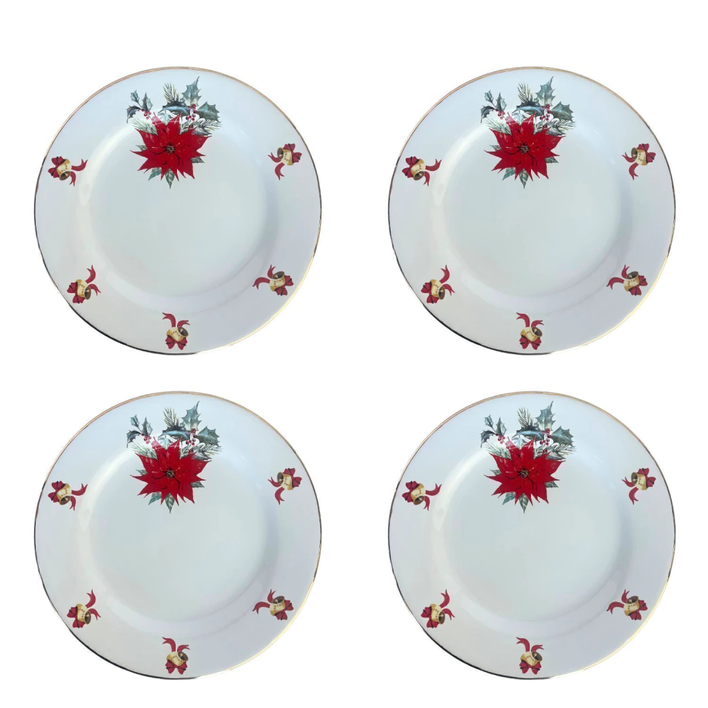 Com fundo branco e uma charmosa flor de Natal em vermelho vibrante, este prato traz elegância imediata à mesa. As bordas com filete dourado acrescentam um toque sofisticado e festivo. Ideal para compor ceias natalinas e servir pratos principais com beleza e refinamento.