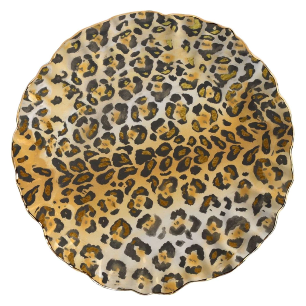 Leve sofisticação e ousadia à sua mesa posta com o Prato Raso Jaguar Dore Scalla. Com estampa animal print em tons de dourado e preto, ele destaca um visual moderno e elegante, perfeito para composições cheias de personalidade.