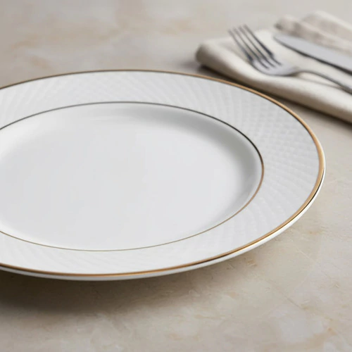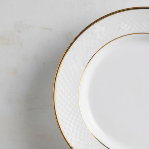Borda com textura delicada em faixas e acabamento metalizado dourado, trazendo brilho e sofisticação sem estampas centrais.
