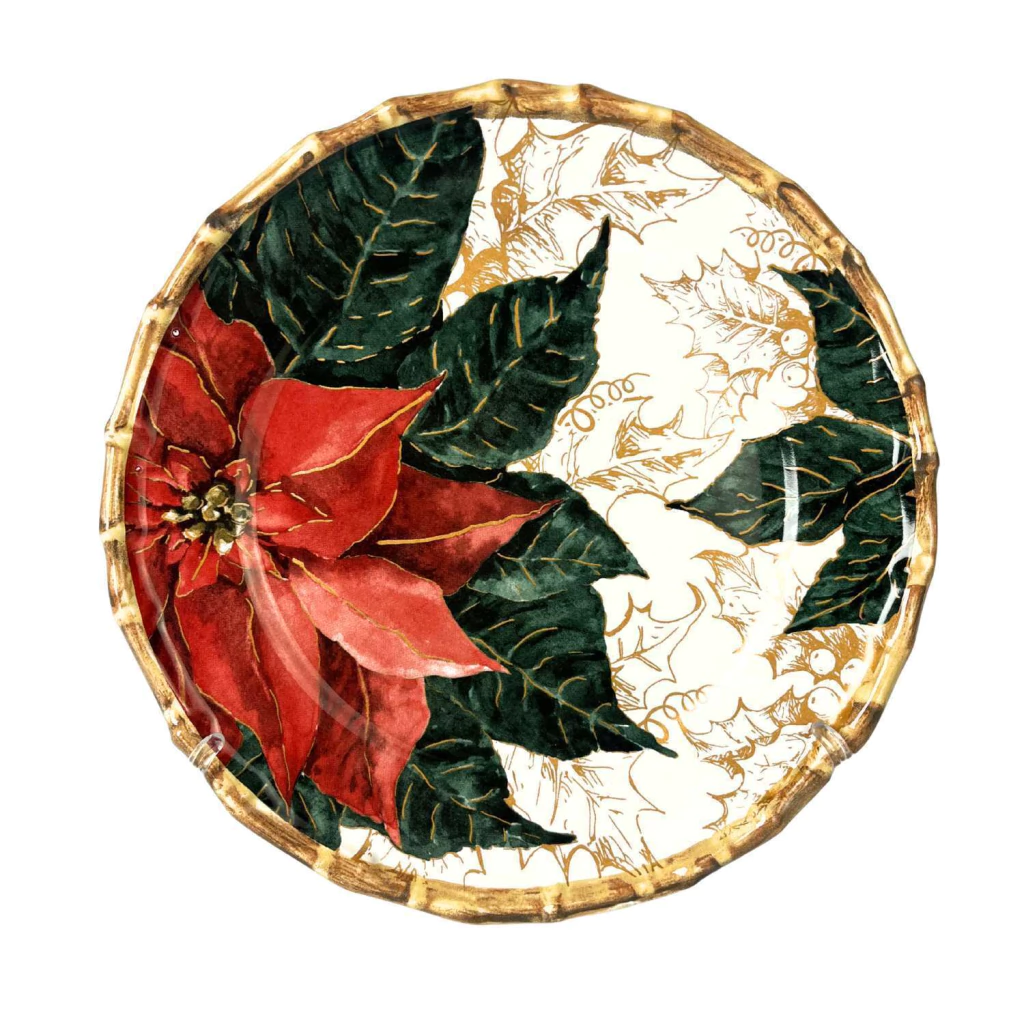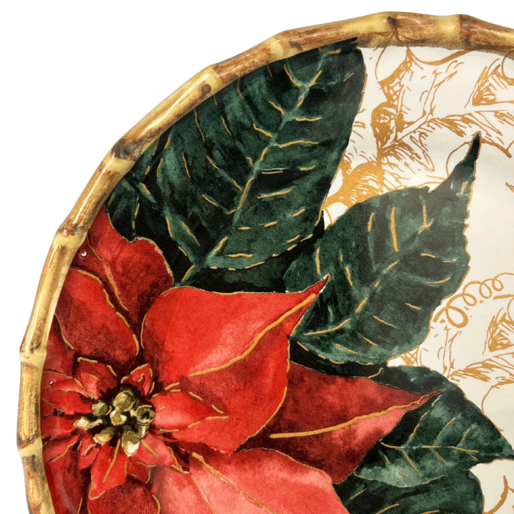 O Prato de Sobremesa Christmas Flowers Maison Blanche é a escolha ideal para compor uma mesa natalina elegante e encantadora. Apresenta um belo acabamento brilhante e uma estampa exclusiva de flores vermelhas e folhagens verdes, símbolo clássico do Natal, realçada por detalhes dourados e uma borda com efeito bambu que adiciona um toque de sofisticação e charme artesanal.