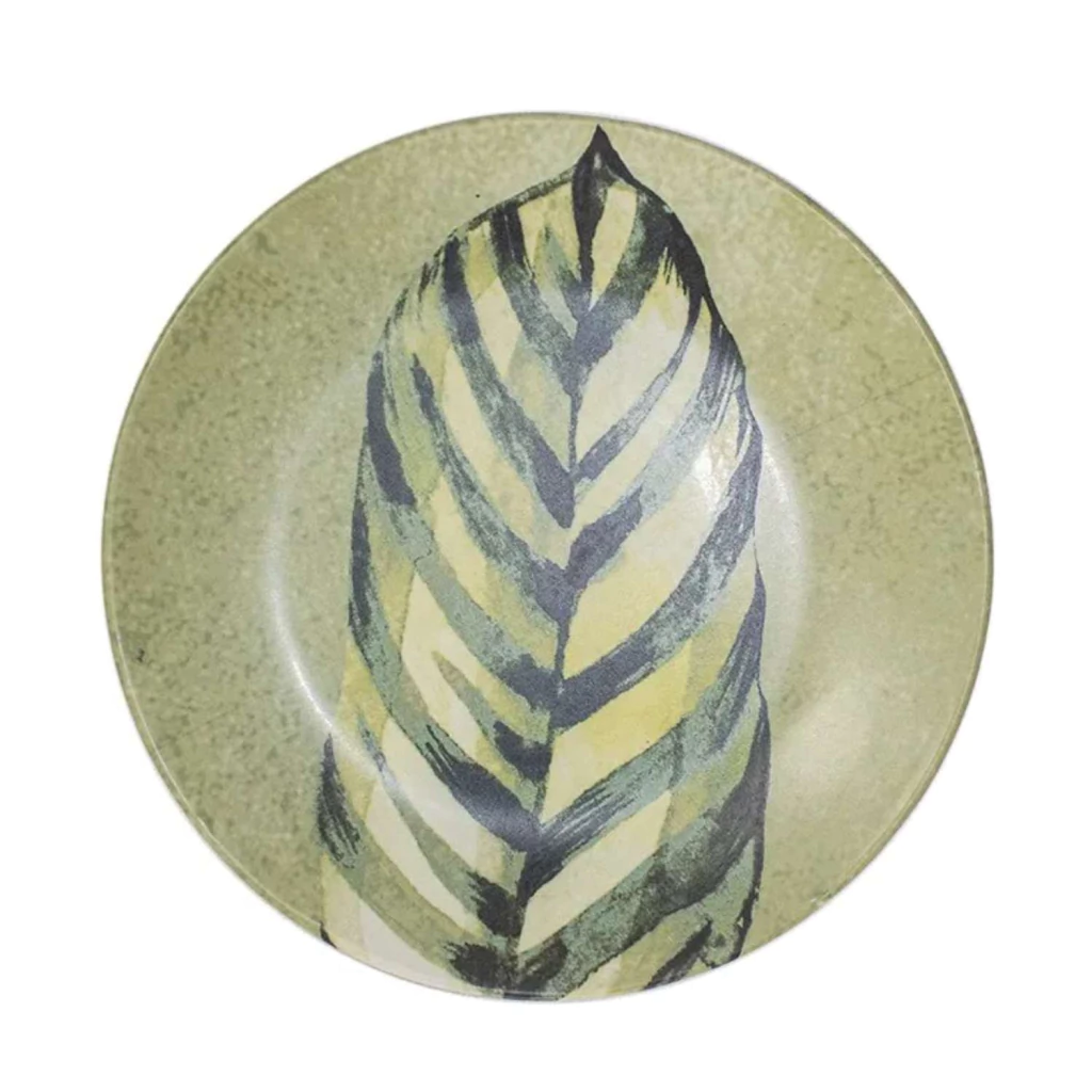 O Prato de Sobremesa Wild Scalla combina elegância contemporânea com um toque natural, perfeito para compor mesas cheias de personalidade. Sua estampa de folha estilizada em tons de verde transmite frescor e modernidade, criando um visual sofisticado e acolhedor.