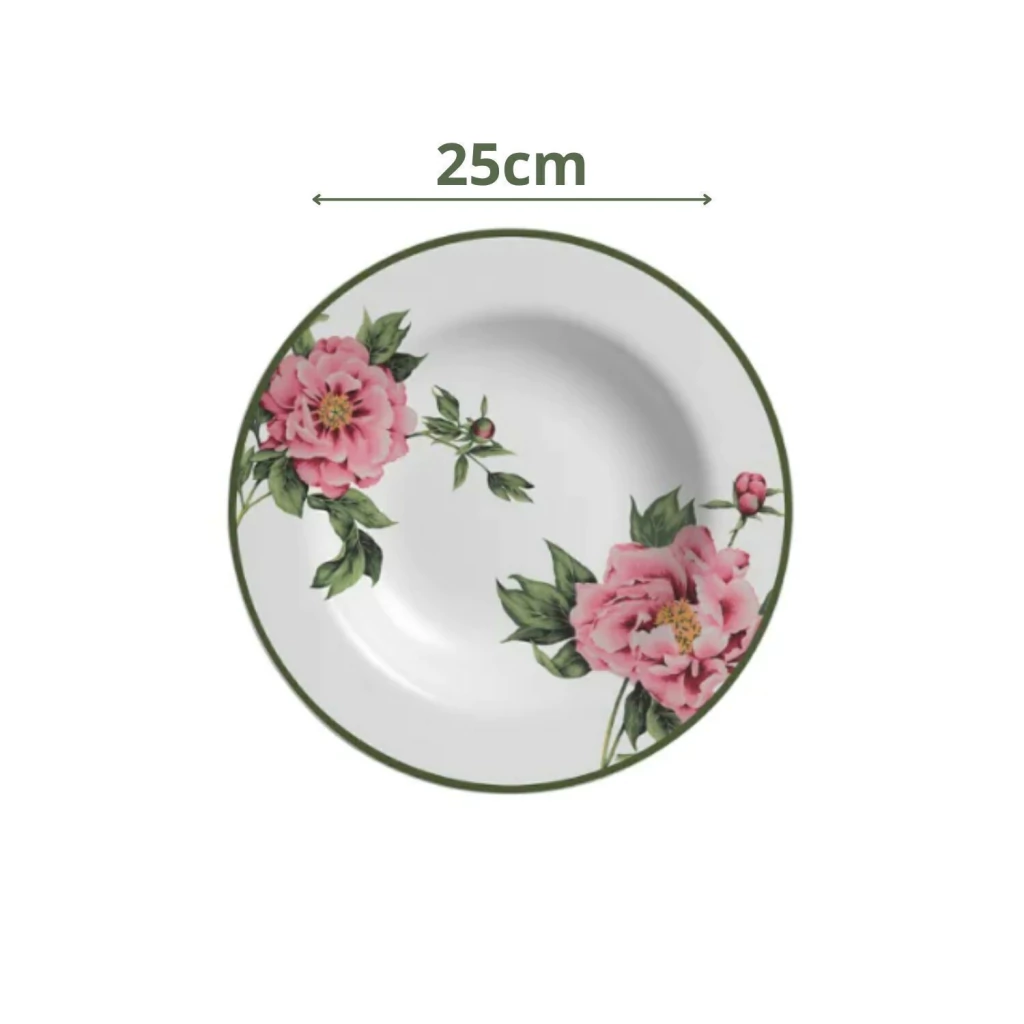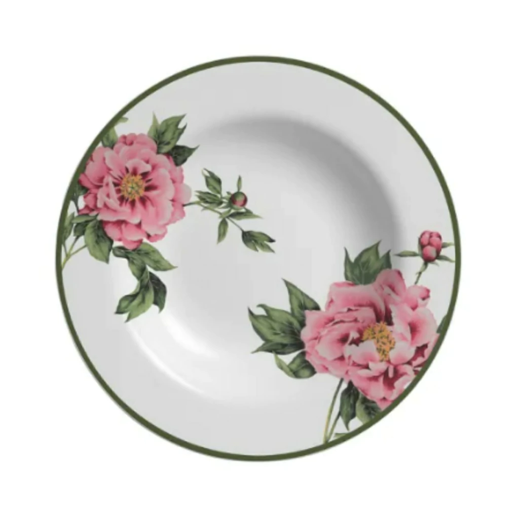 Com estampa de peônias em tons delicados, o prato fundo Peony Rose traz elegância e suavidade à mesa.