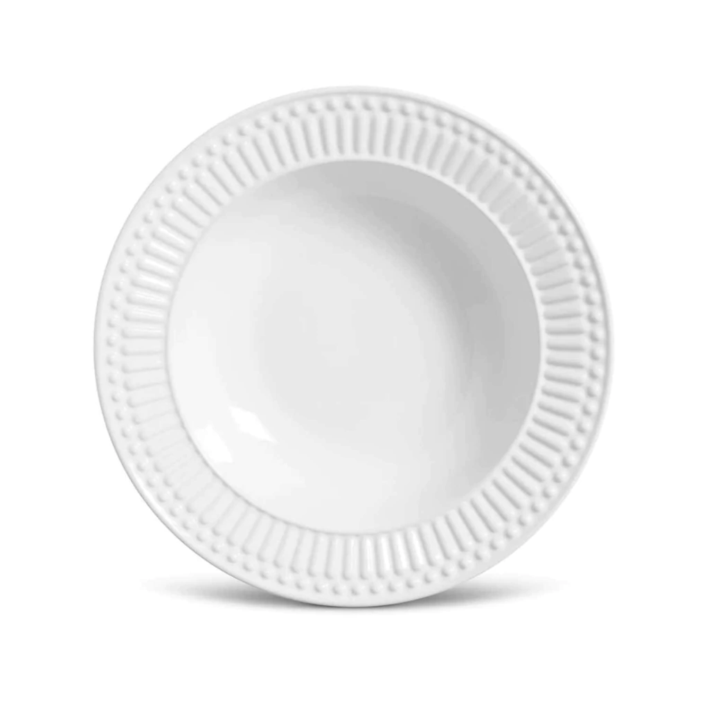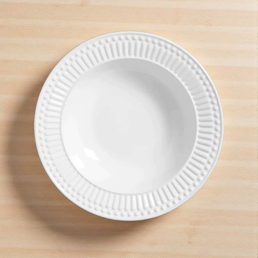 Elegantes pratos fundos com relevo inspirado em colunas romanas, em cerâmica sofisticada.
