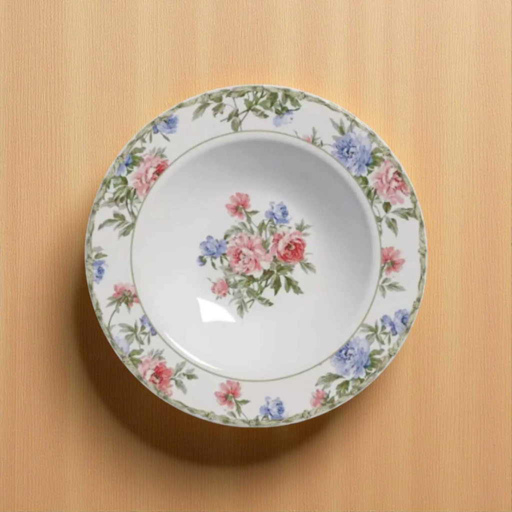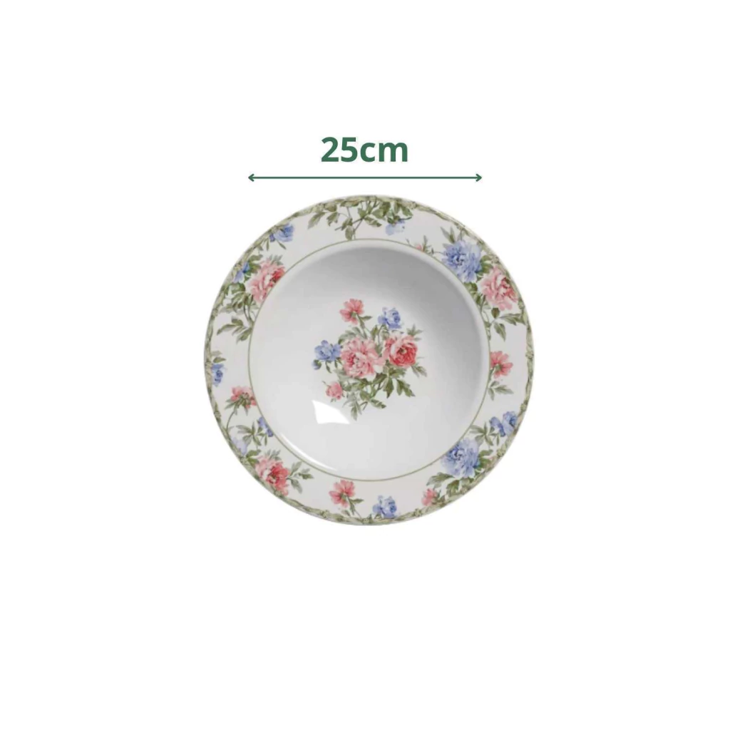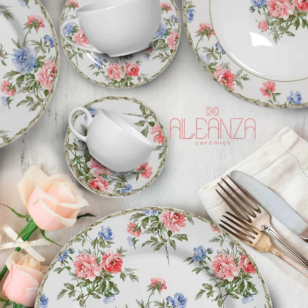 Romântica combina graciosas flores em tons suaves sobre cerâmica branca de alta resistência, com decoração digital refinada. A textura lisa e o acabamento impecável valorizam qualquer mesa posta. Práticos e elegantes, são seguros para micro‑ondas e lava‑louças.