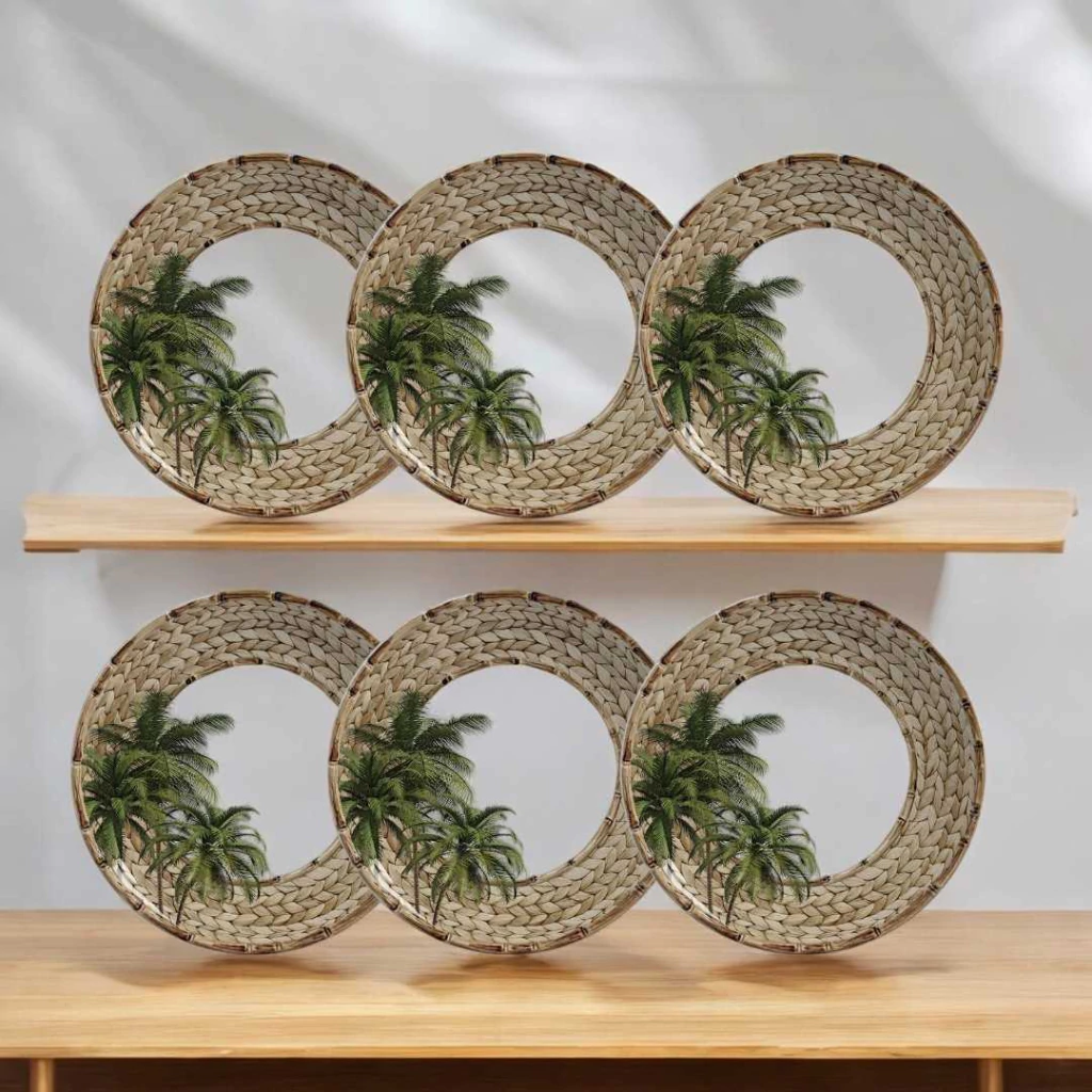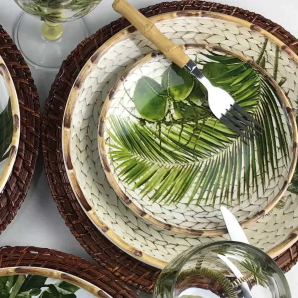 Esse conjunto é perfeito para quem valoriza elegância e sofisticação à mesa. Com design inspirado na natureza, os pratos apresentam um delicado padrão de coqueiros, trazendo um toque tropical e contemporâneo para qualquer refeição.