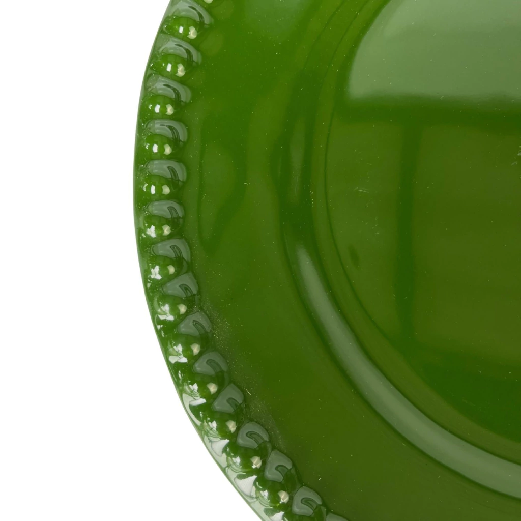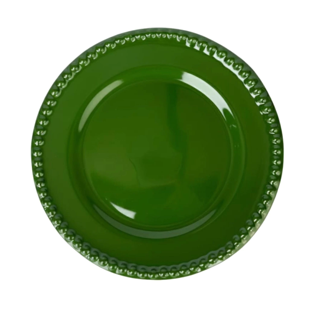 Prato raso na cor verde floresta, com bordas adornadas por bolinhas em relevo que trazem um toque sofisticado e contemporâneo. Peça perfeita para compor mesas elegantes e acolhedoras. Ideal para jantares especiais e celebrações.