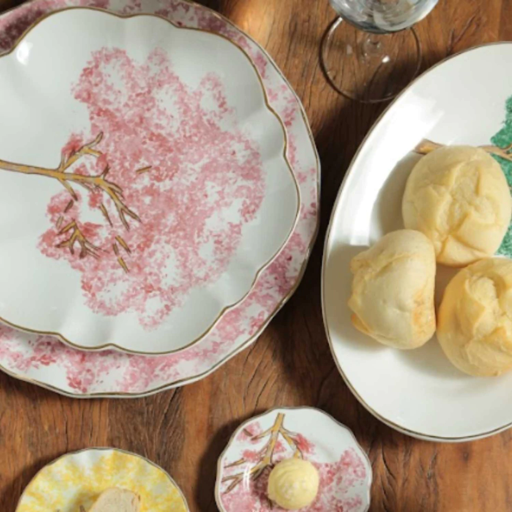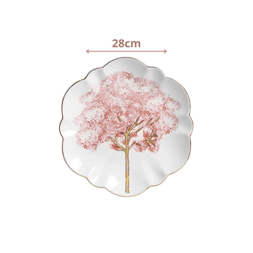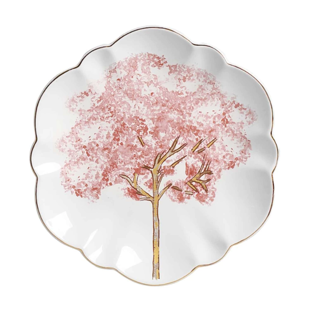 Um prato raso branco com estampa delicada de um ipê rosa em pleno florescer.
