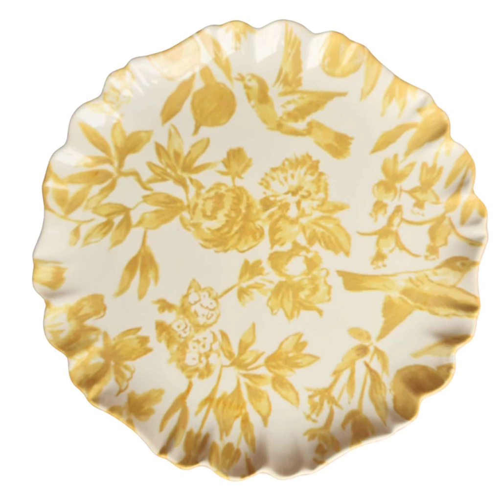 O Prato Raso Decorado Pássaros Amarelo Scalla é uma peça que combina sofisticação e leveza em um design encantador. Produzido em cerâmica de alta qualidade, apresenta bordas onduladas e um delicado padrão floral com pássaros em tom amarelo, trazendo charme e personalidade à mesa.
