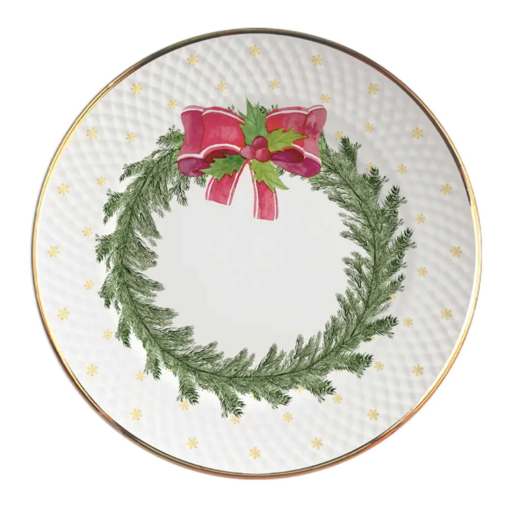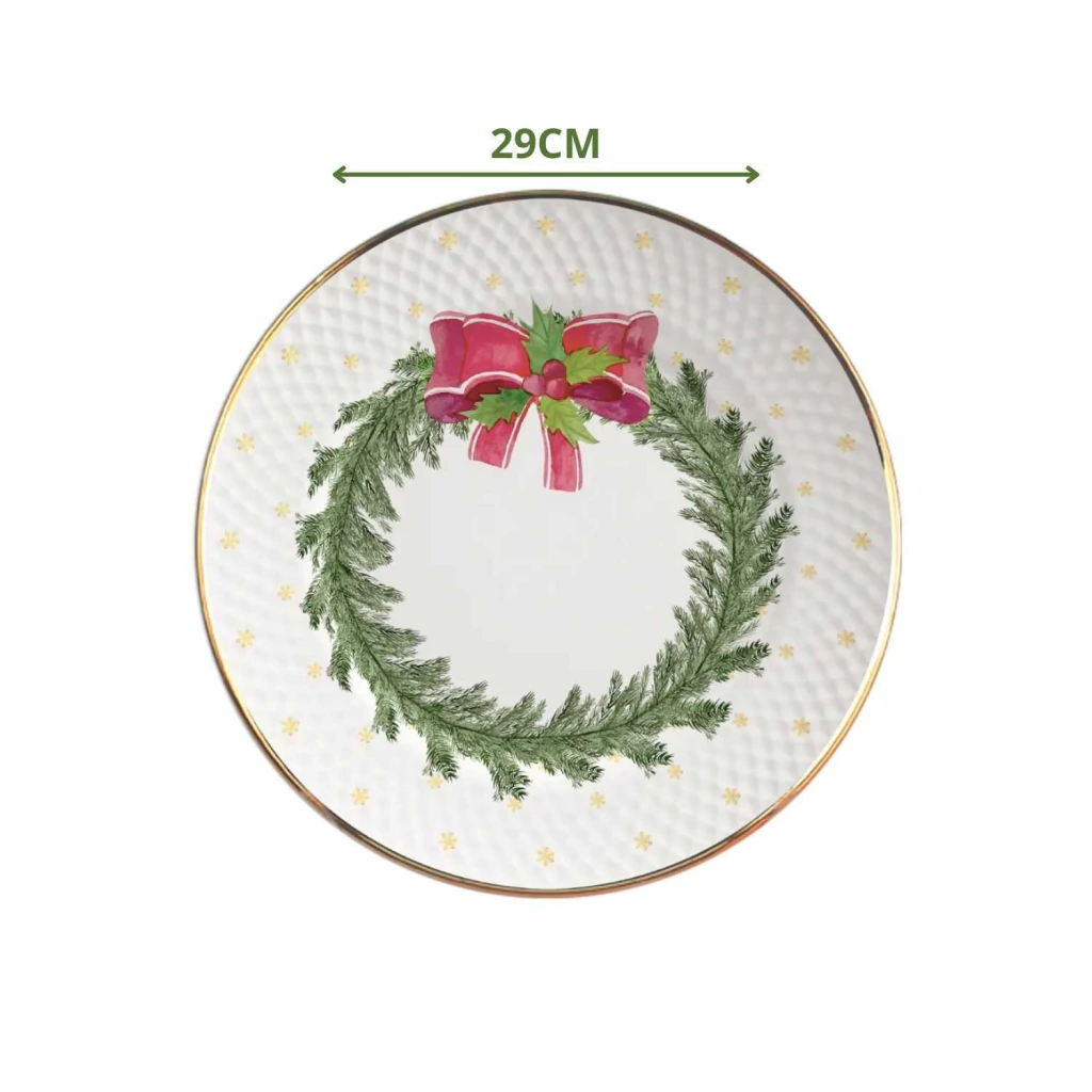 Prato raso elegante e sofisticado, com acabamento branco impecável e filete dourado. Ao centro, uma delicada guirlanda natalina traz charme e aconchego à mesa. Ideal para compor ceias e almoços festivos com estilo refinado.