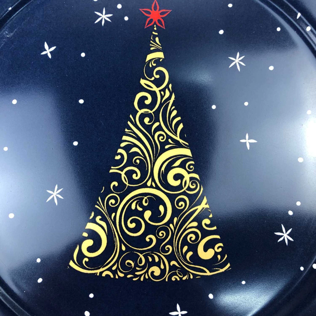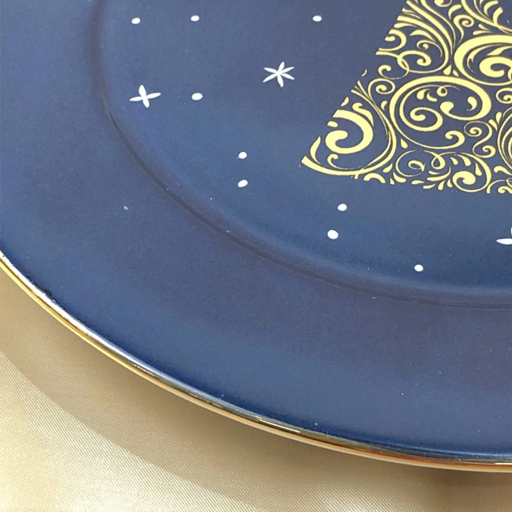 Pratos rasos Christmas Lights Scalla em tom azul profundo com filetes dourados e detalhes que lembram luzes natalinas cintilantes.