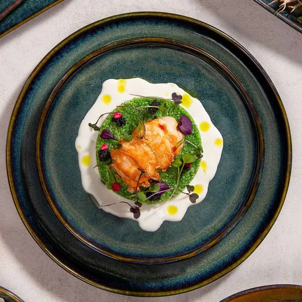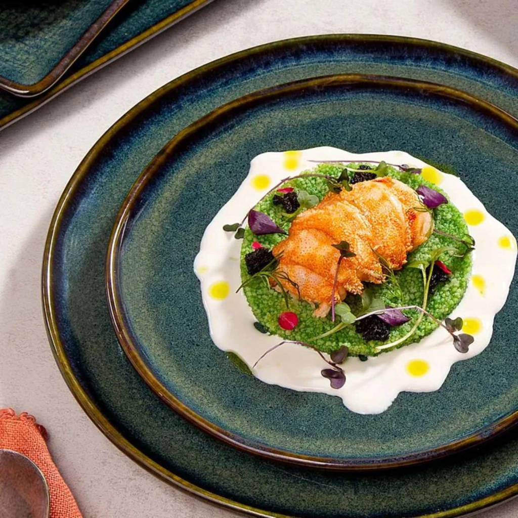 Apresenta um design que reflete a biodiversidade marinha, com elementos e detalhes artísticos que acentuam a superfície, com acabamento em tons inspirado no oceano.