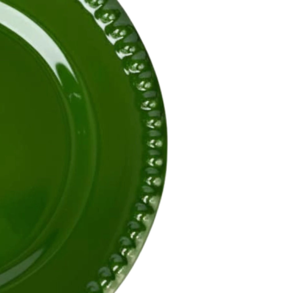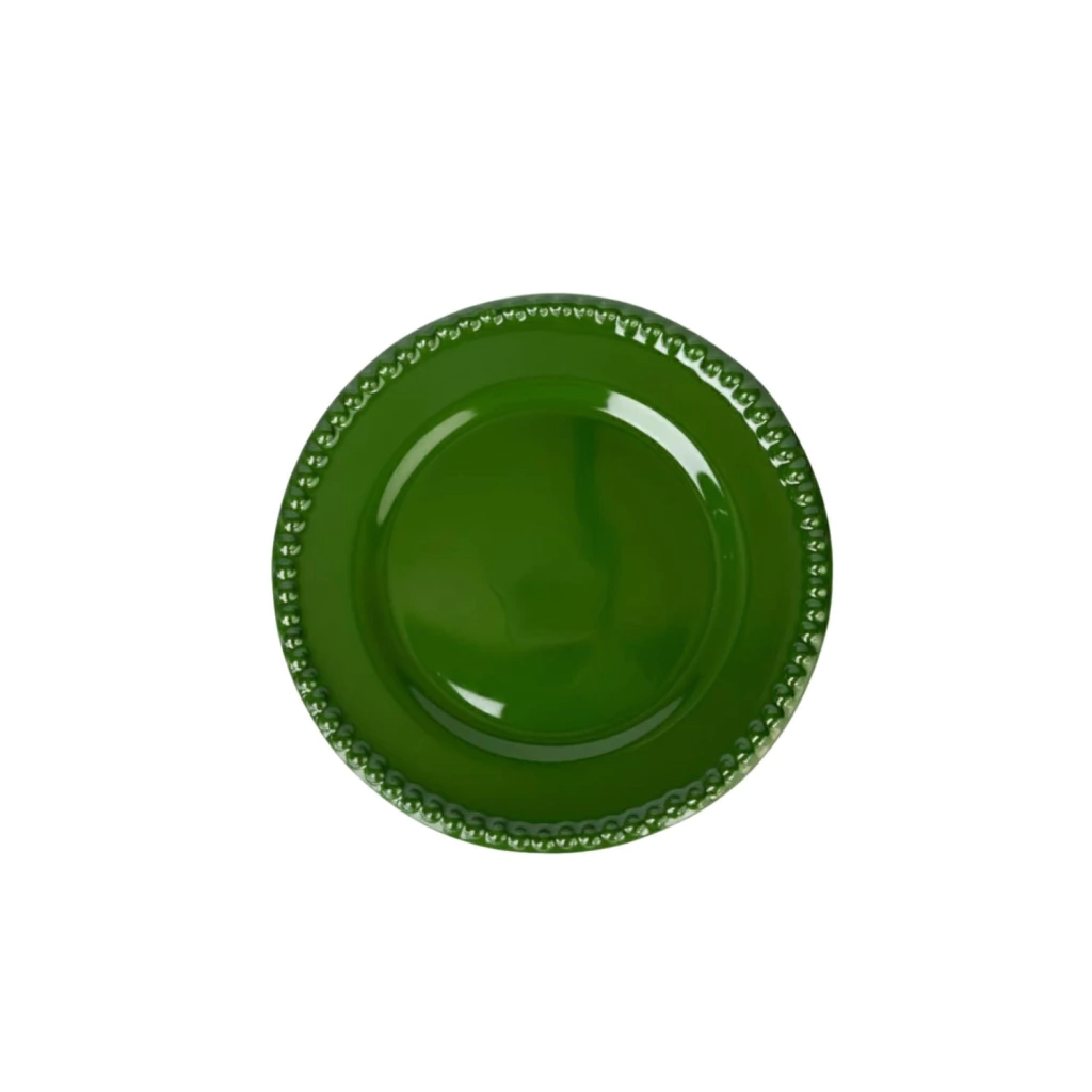 Prato de sobremesa na cor verde floresta, com borda em relevo de bolinhas que traz um toque sofisticado e acolhedor. Ideal para servir doces, tortas e frutas com elegância. Perfeito para compor mesas temáticas ou ocasiões especiais.