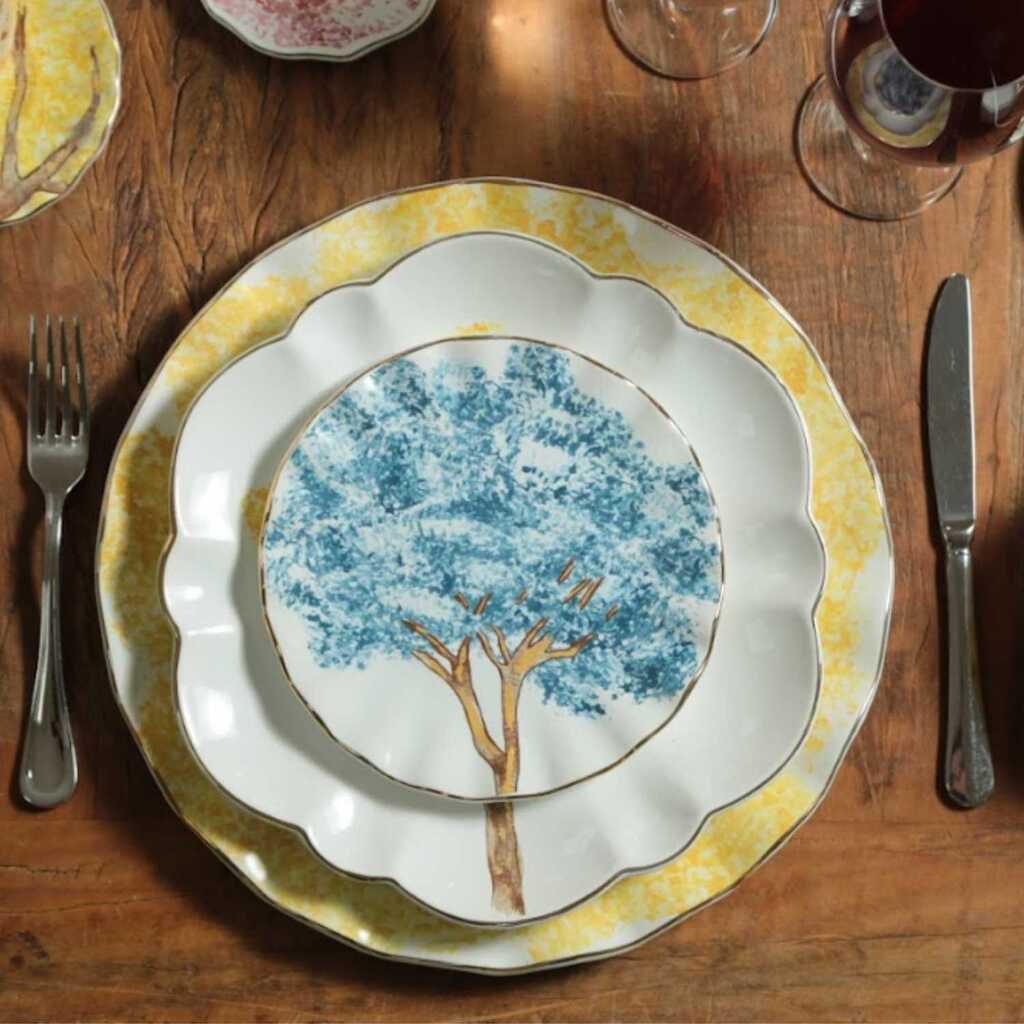 Prato branco com estampa de um ipê azul em destaque no centro.