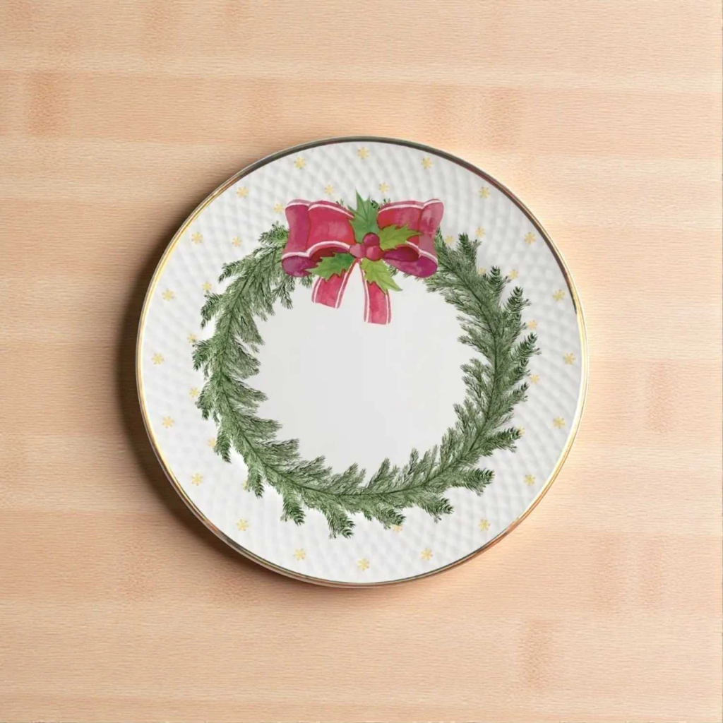 Pratos de sobremesa que esbanjam charme e sofisticação. No tom branco puro, ganham filete dourado e delicada guirlanda natalina no centro. Perfeitos para servir doces e sobremesas com um toque festivo e elegante.