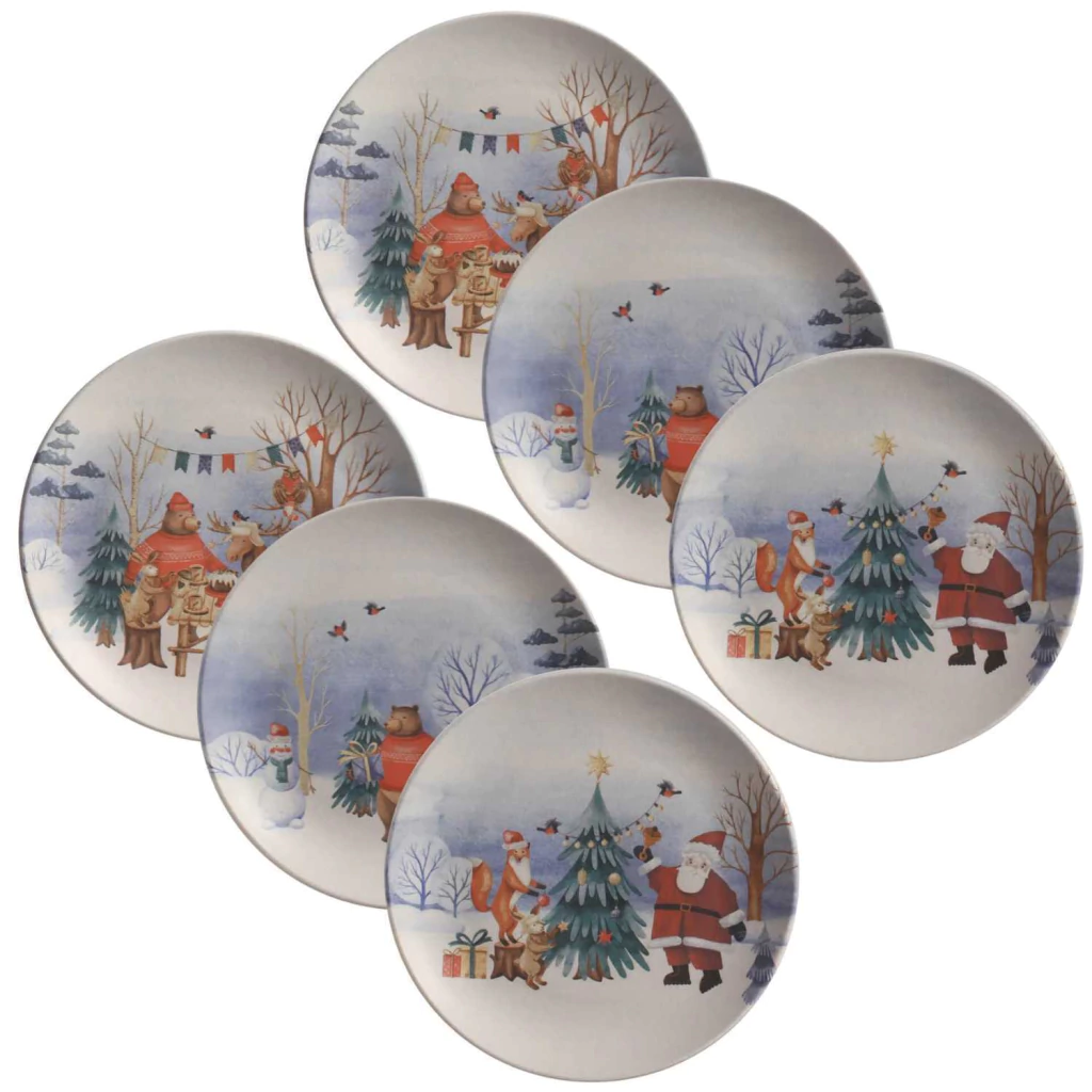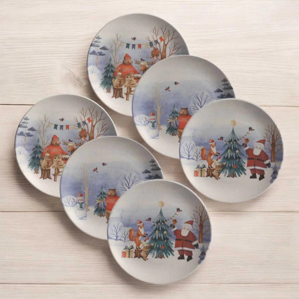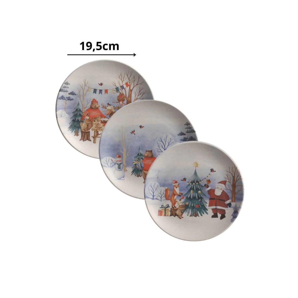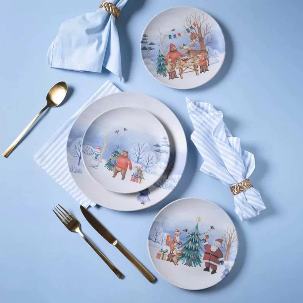 O prato traz um adorável urso como protagonista, em um cenário natalino repleto de festividade e magia. O design inclui detalhes como decorações festivas e elementos de inverno que tornam o prato ainda mais encantador.