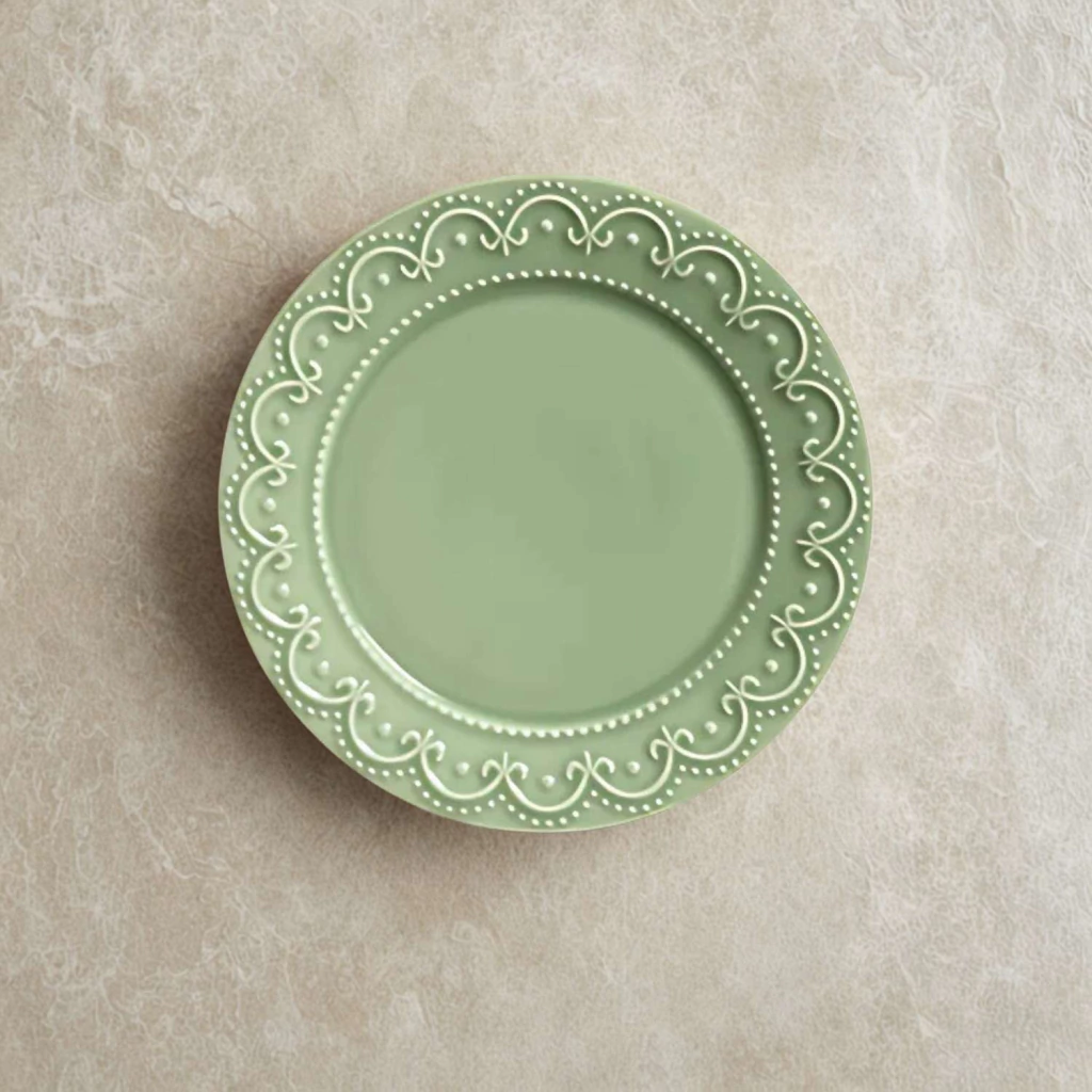 Pratos sobremesa em verde sálvia suave da linha Princess Scalla, com acabamento que traz serenidade à mesa.