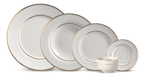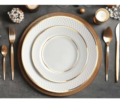 Produzido em cerâmica de alta qualidade, apresenta tom claro e filete dourado que valoriza mesas elegantes e composições festivas.