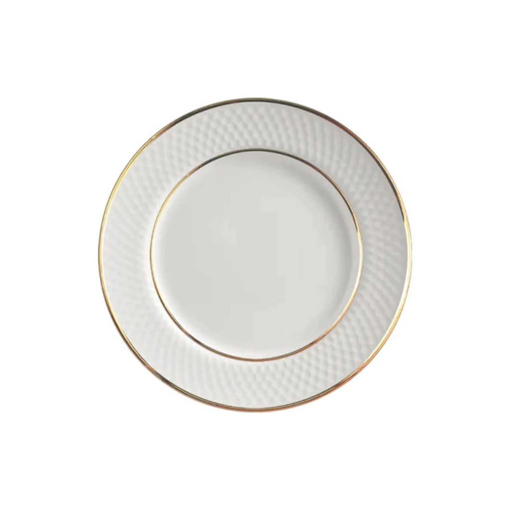 Borda com efeito texturizado em faixas e acabamento metalizado dourado, criando um visual sofisticado e moderno sem estampas centrais.
