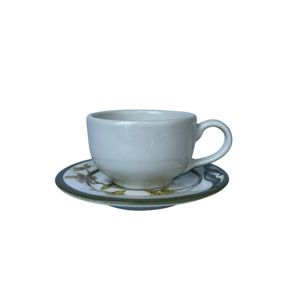 Xícara de café com pires em porcelana branca, adornada por uma delicada estampa de orquídeas em tons suaves, trazendo leveza e elegância à mesa.