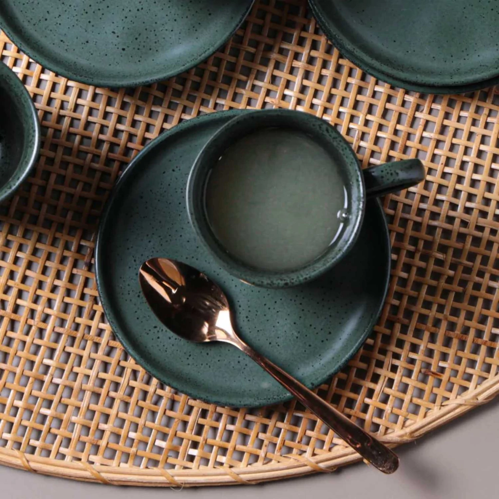 Um conjunto que respira natureza: cerâmica verde com textura orgânica e acabamento artesanal, transmitindo calma e sofisticação.