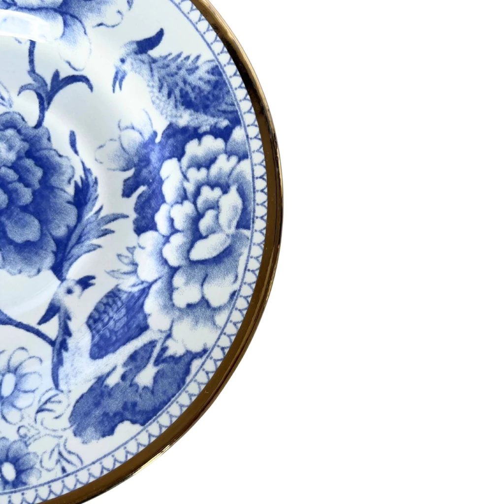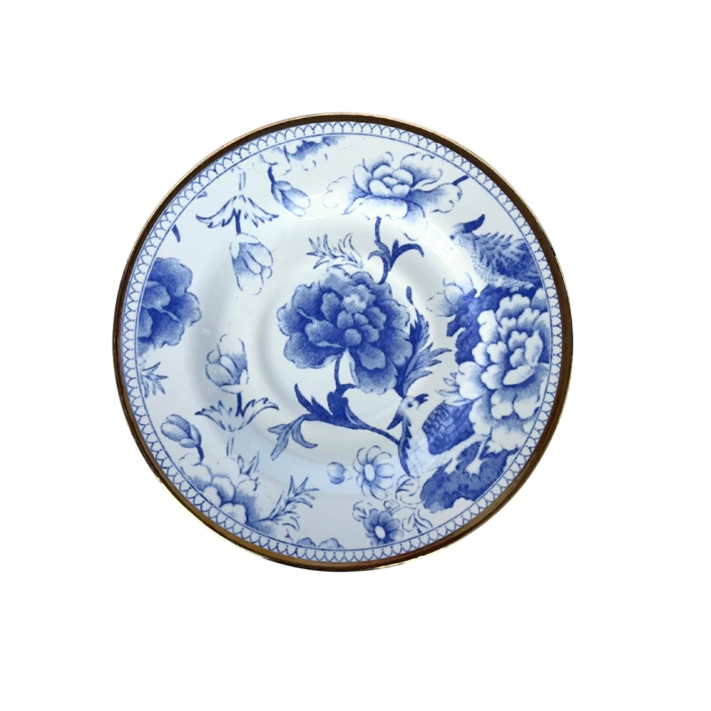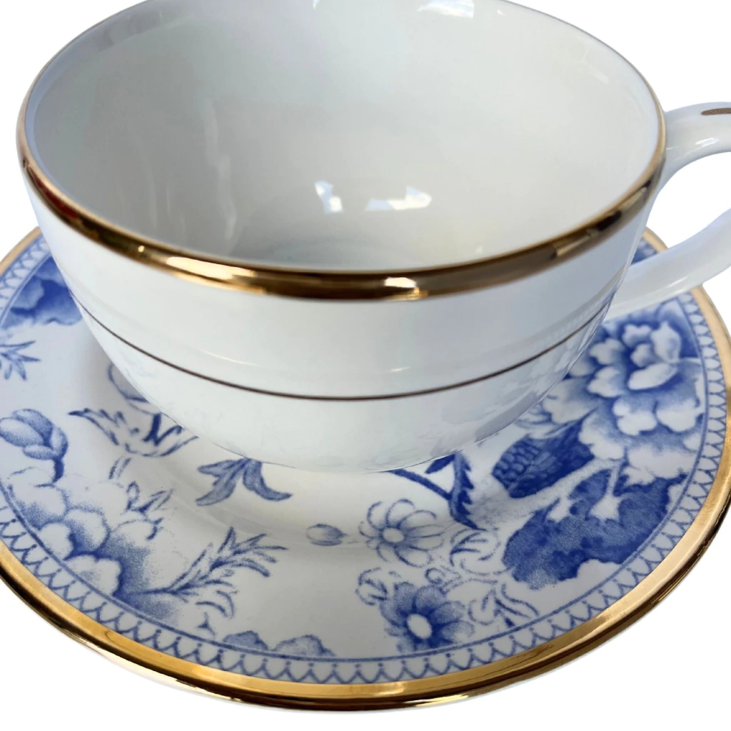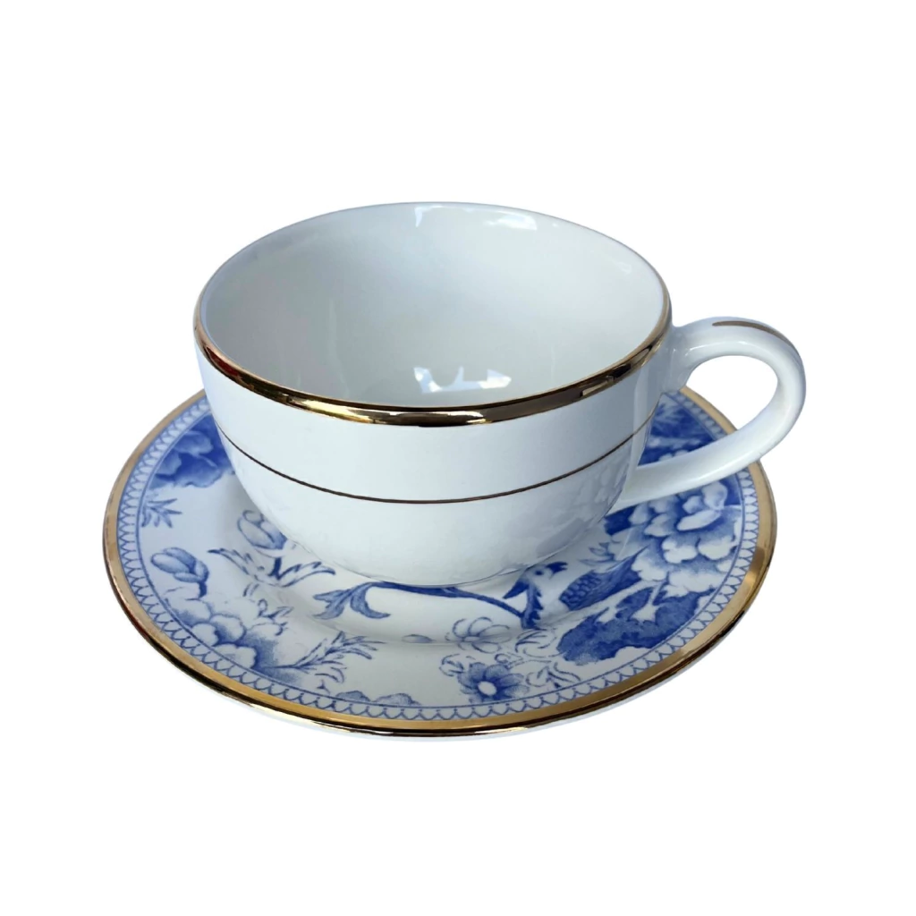 Xícara de chá branca com pires, decorada com a clássica estampa Chinese Blue que traz arabescos azulados delicados e atemporais.