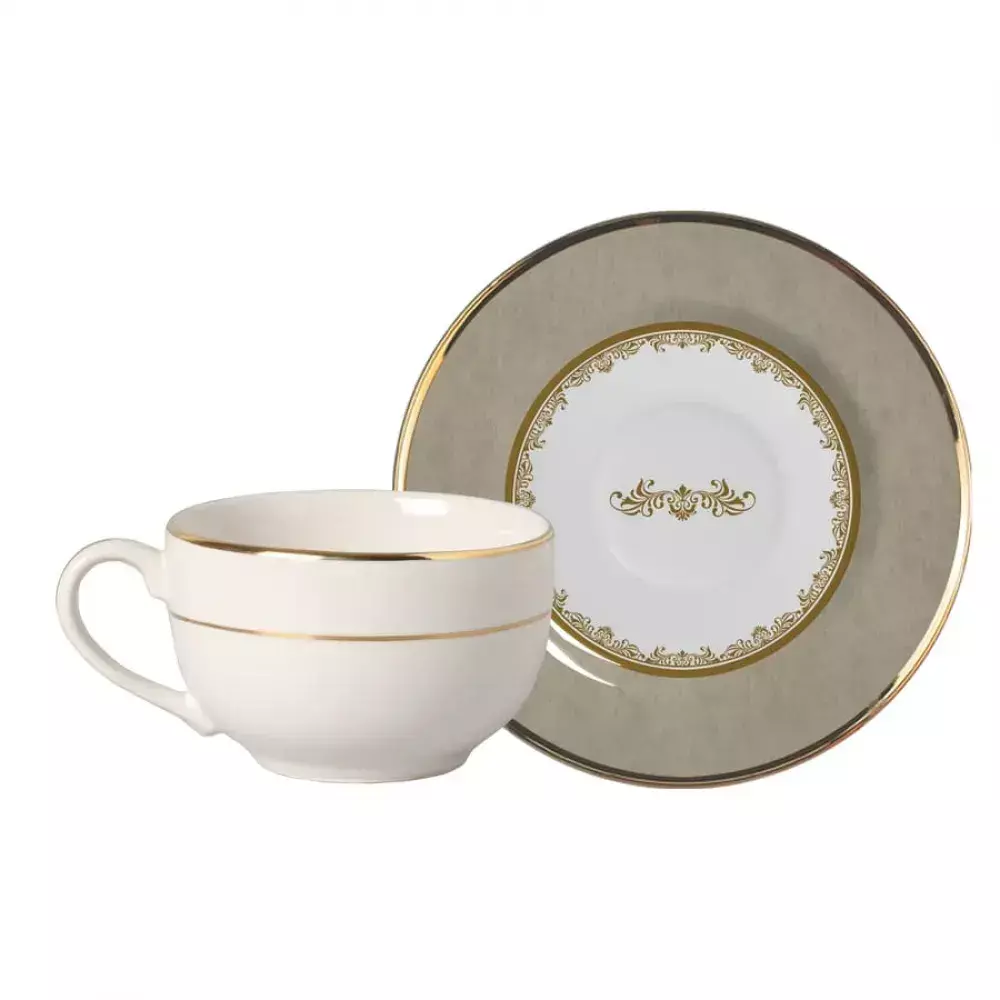 Xícara de chá com pires em porcelana branca, decorada com a elegante estampa Monte Carlo em tom fendi, que adiciona sofisticação sem excessos.