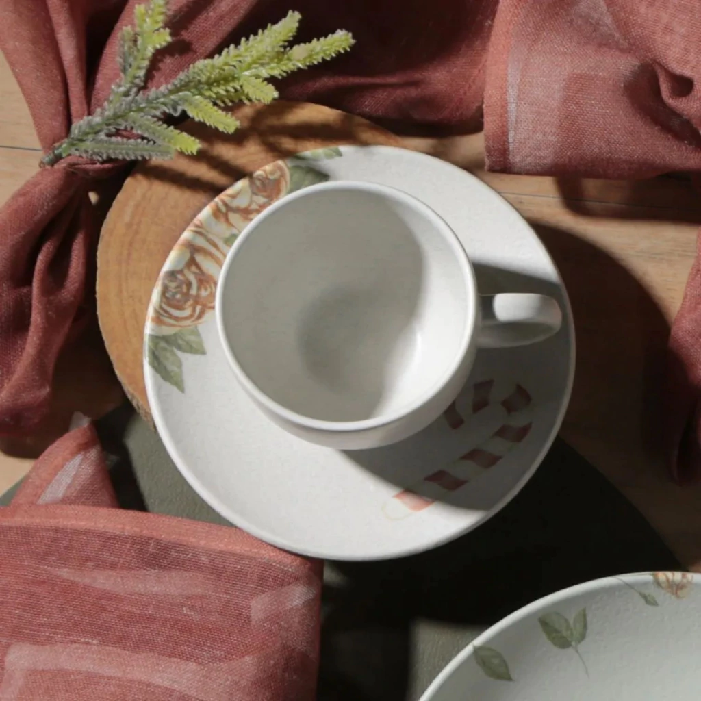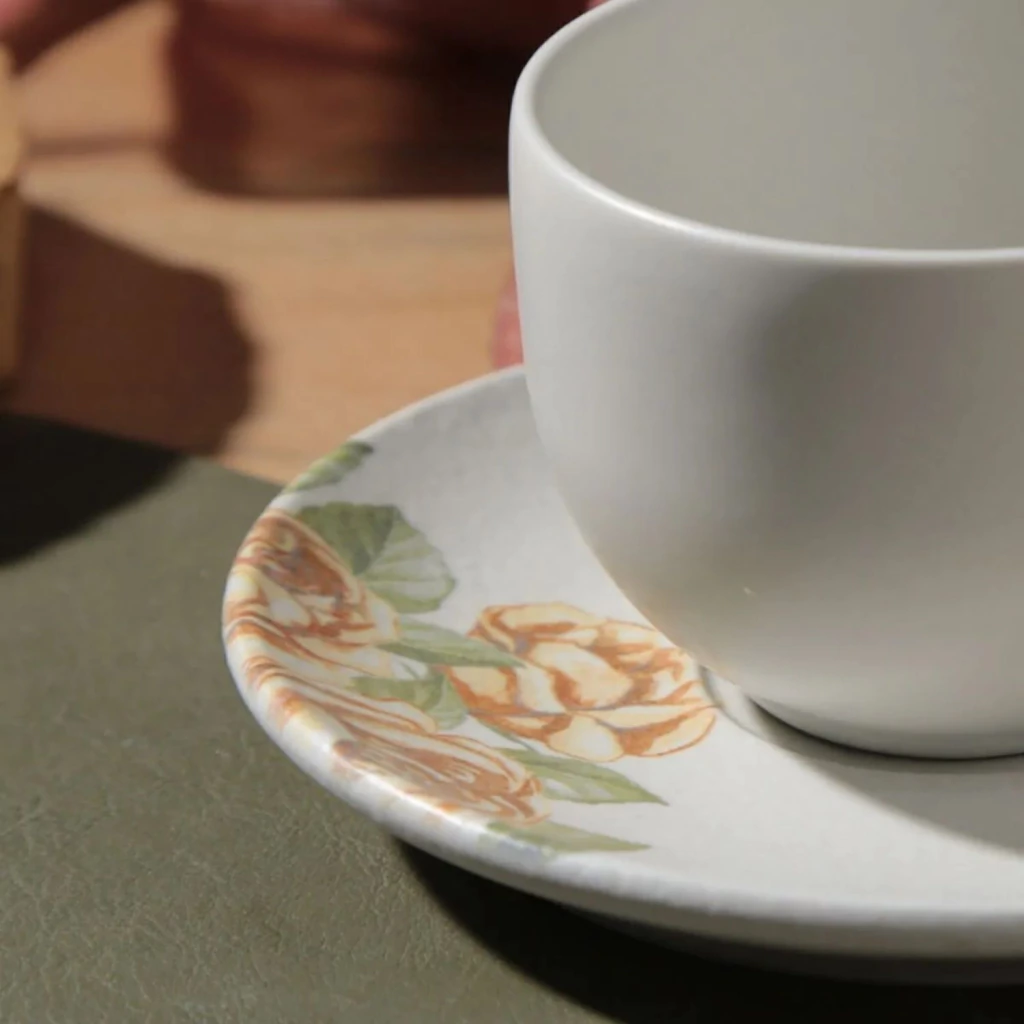 Acabamento fosco com tons tradicionais e ilustrações detalhadas criam uma proposta acolhedora para servir chá com estilo.