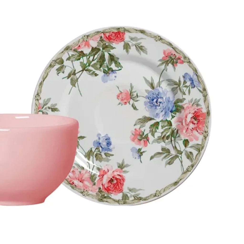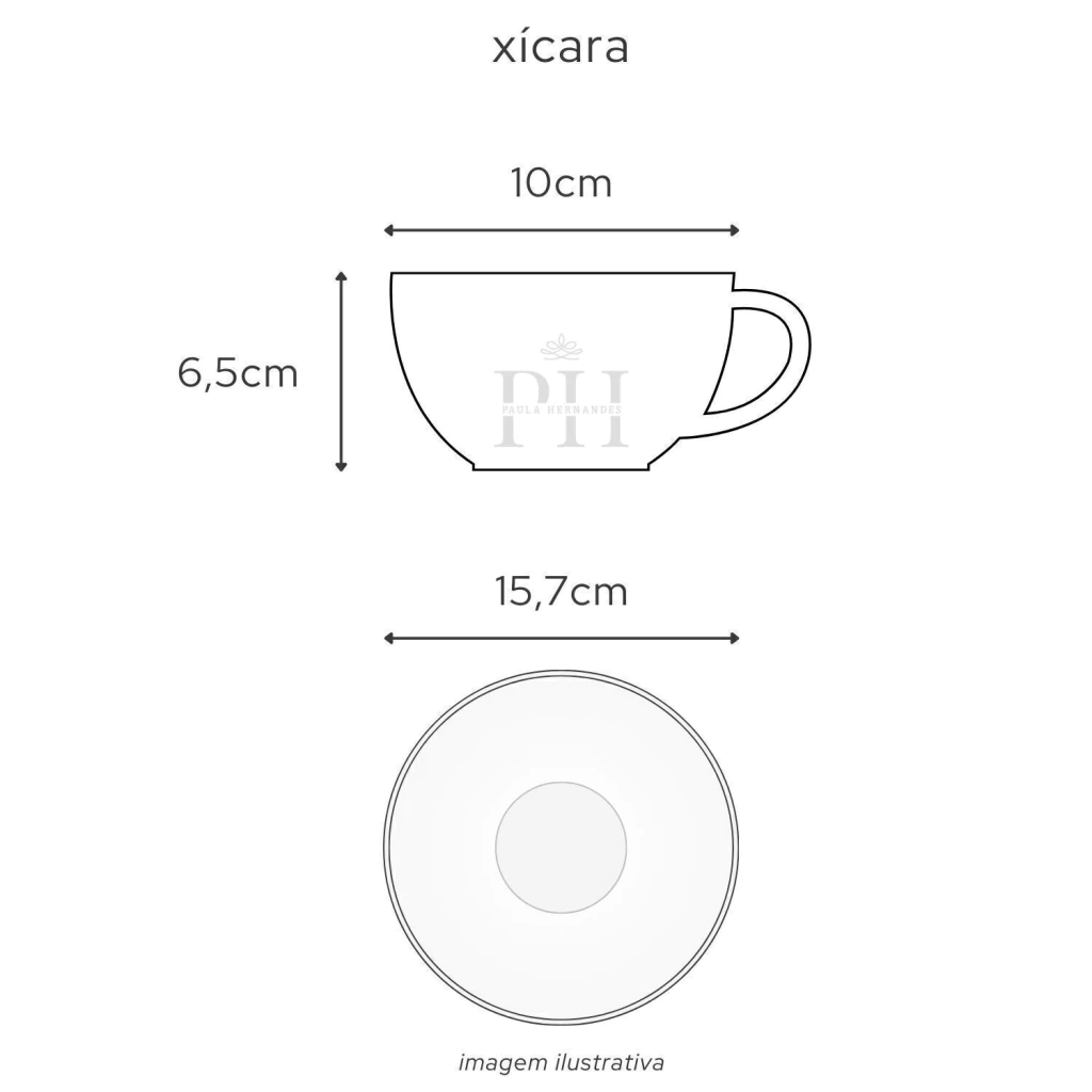 A xícara com pires traz desenho floral clássico sem treliça, resultando em uma peça leve, feminina e muito elegante.