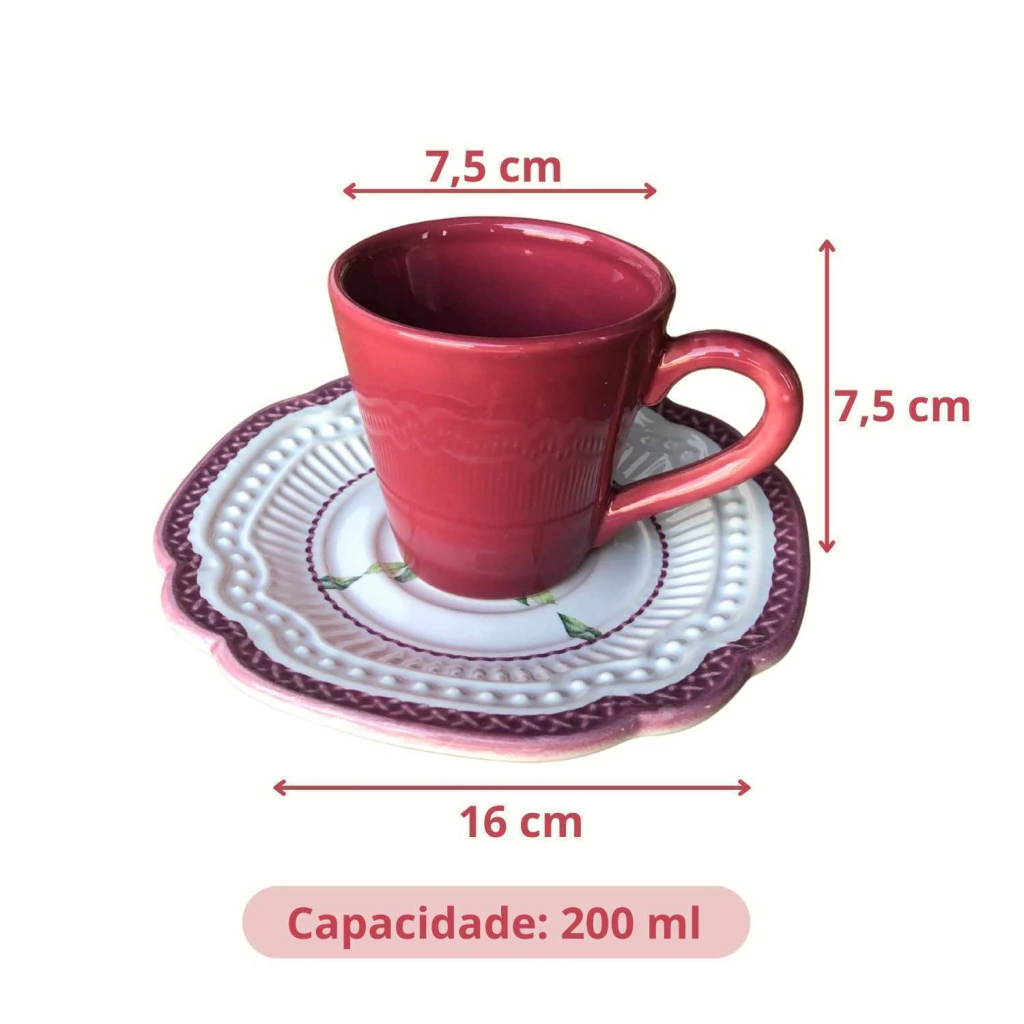 CONJUNTO 6 XÍCARAS DE CHÁ COM PIRES NATAL LAÇOS DE JARDIM ROSA SCALLA
