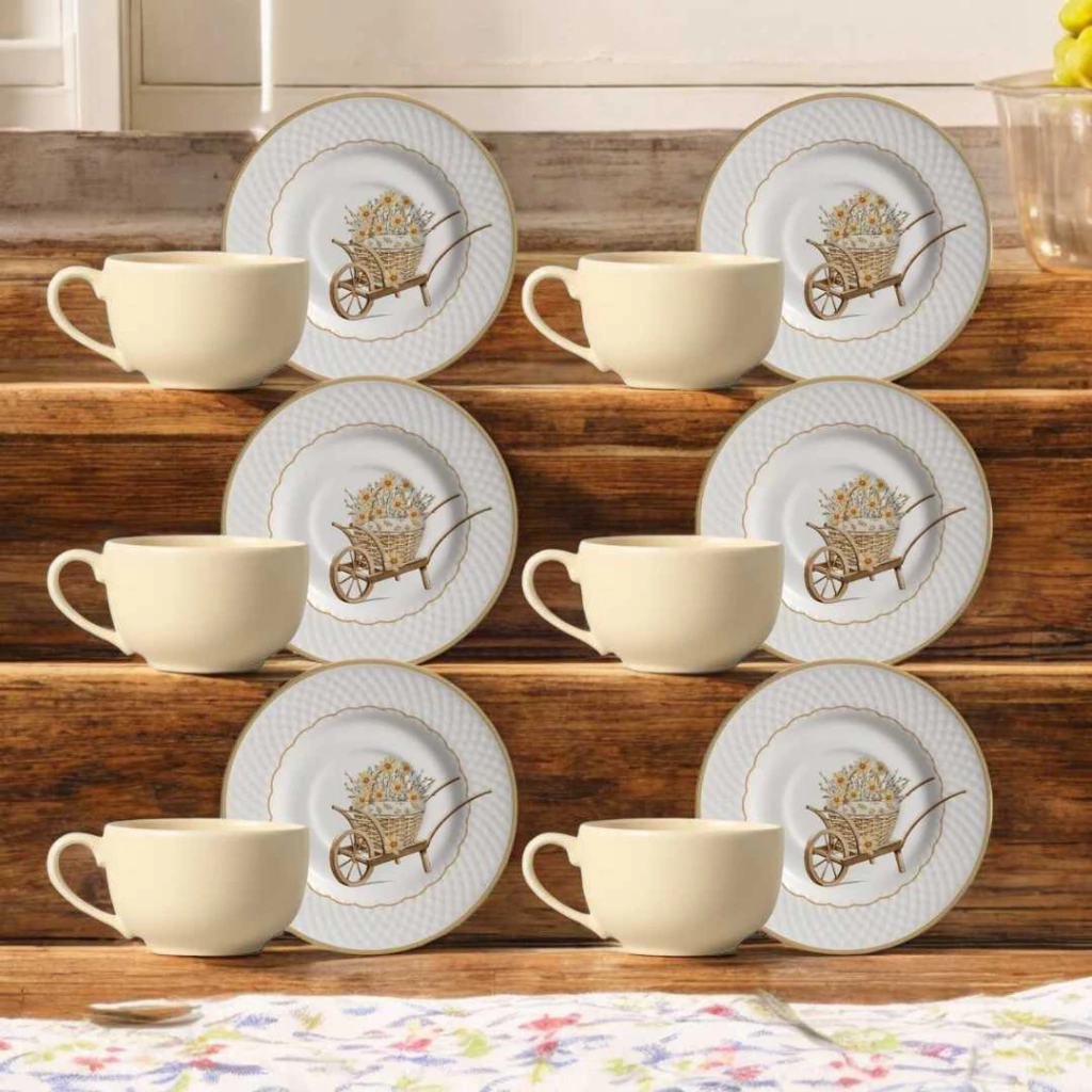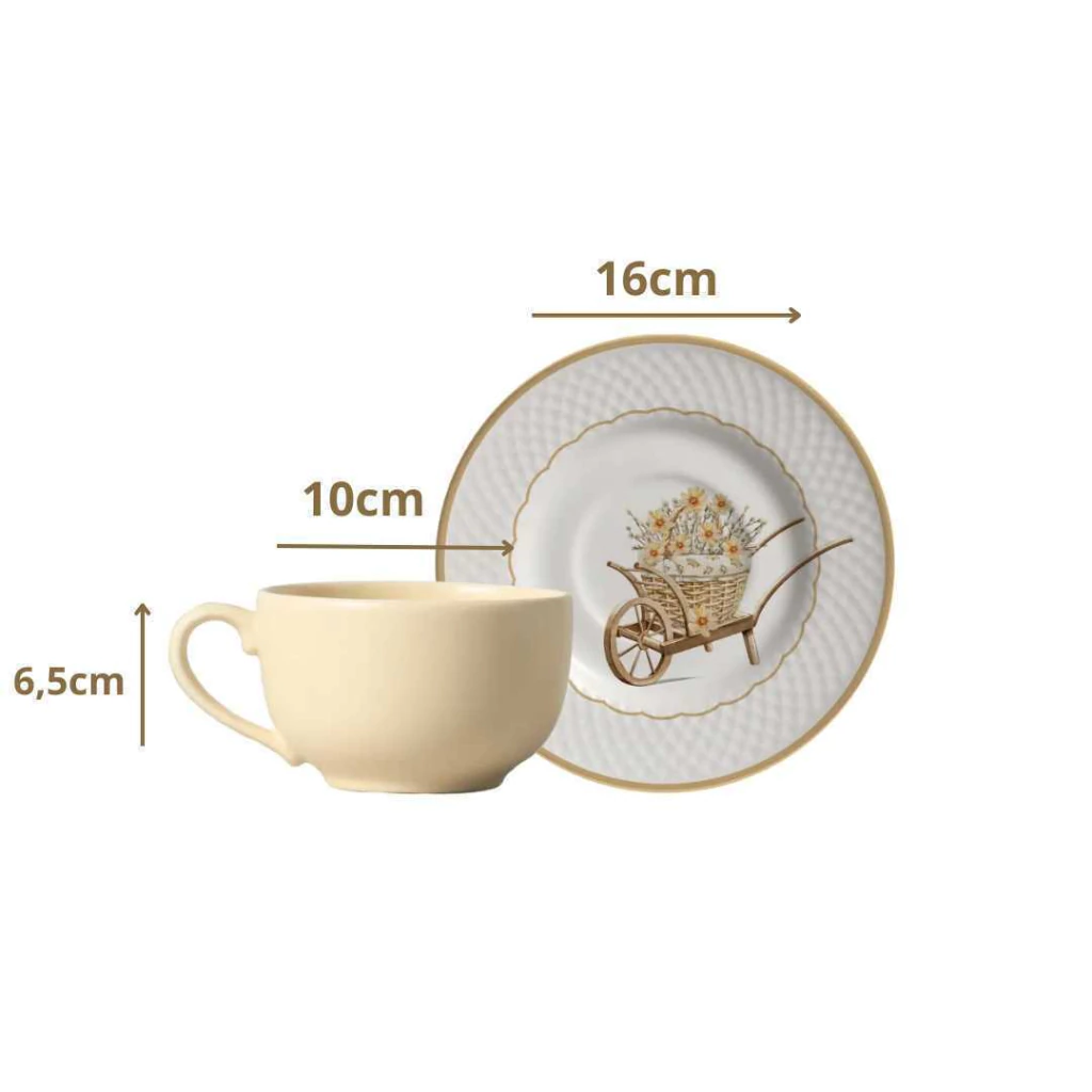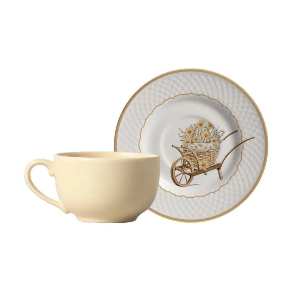 A Xícara de Chá Nude com Pires Huppert 1ª Linha da Alleanza é uma peça que une sofisticação e delicadeza, ideal para momentos especiais. Produzida em cerâmica de alta qualidade, a xícara apresenta um tom nude acetinado que confere elegância à composição. O pires destaca-se pela estampa central de uma carriola repleta de flores, adicionando um toque romântico e encantador ao conjunto.