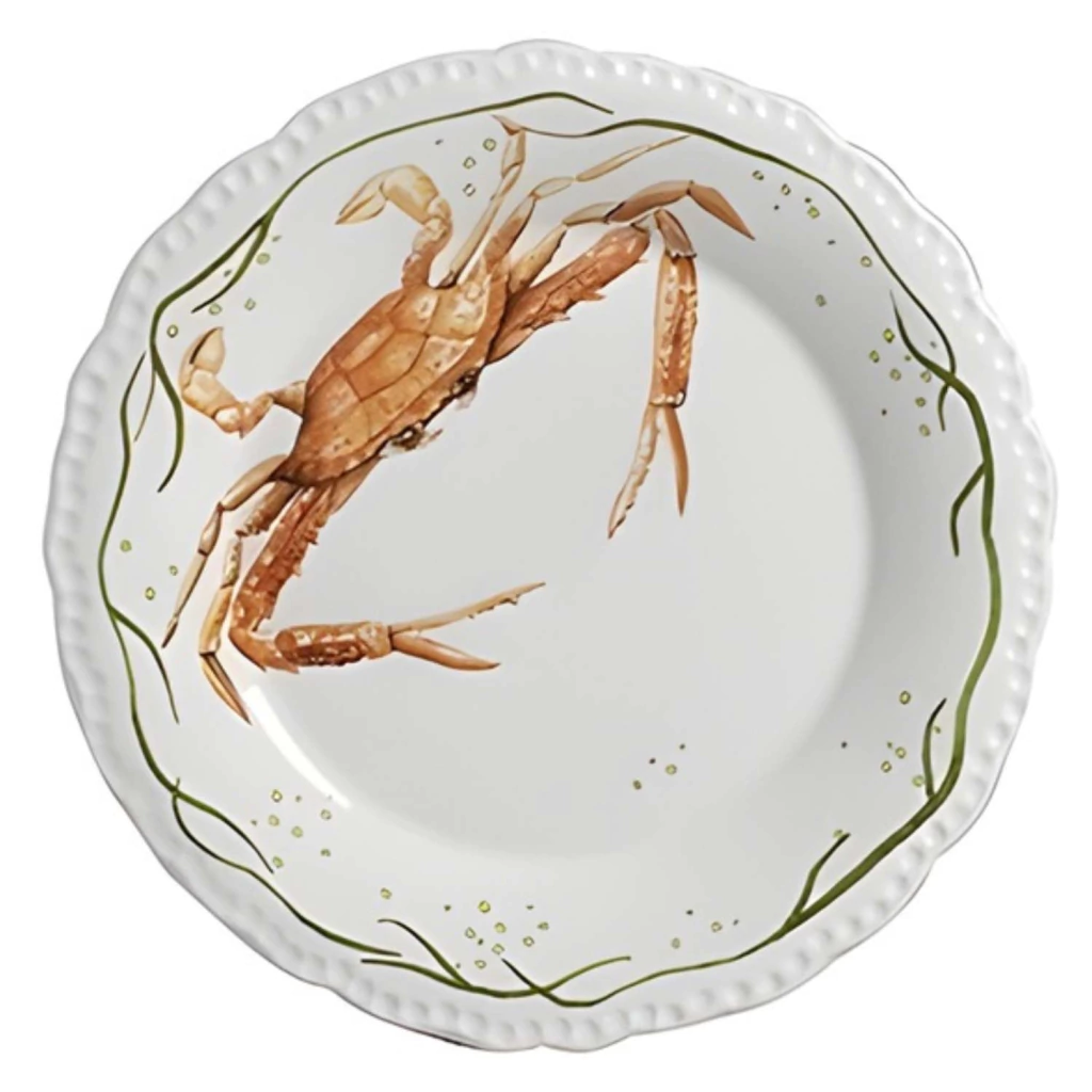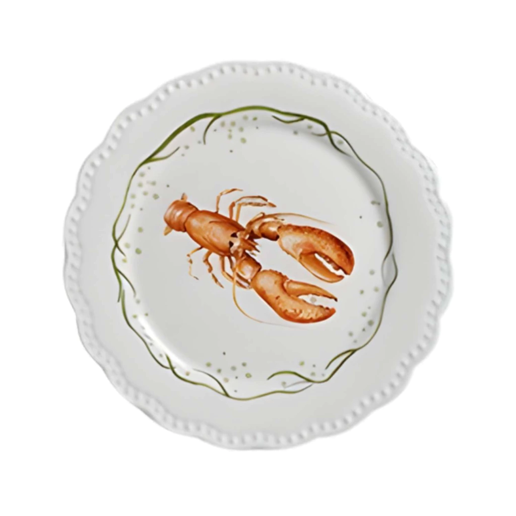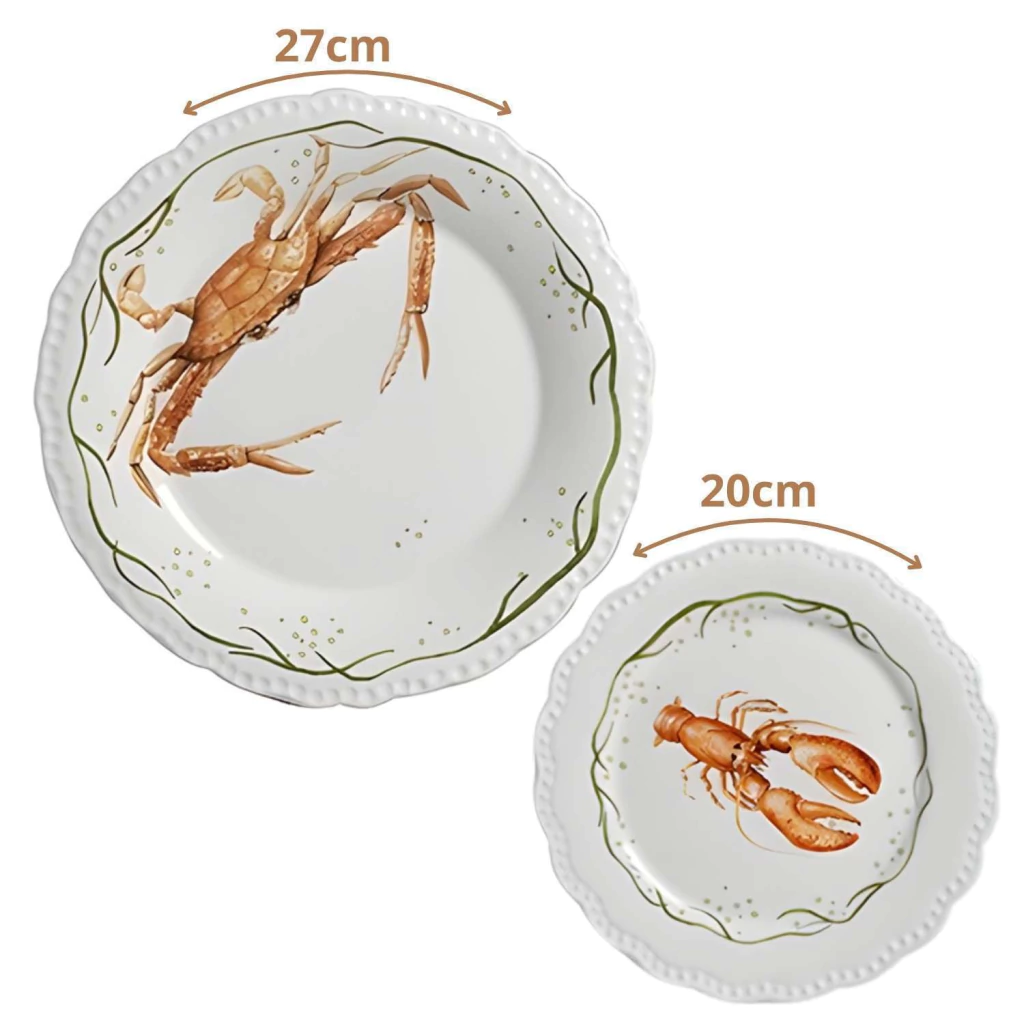 Conjunto com 12 pratos em louça branca, sendo 6 pratos rasos e 6 pratos de sobremesa, ambos com estampa lateral inspirada no universo marinho — caranguejo nos rasos e lagosta nos de sobremesa.
