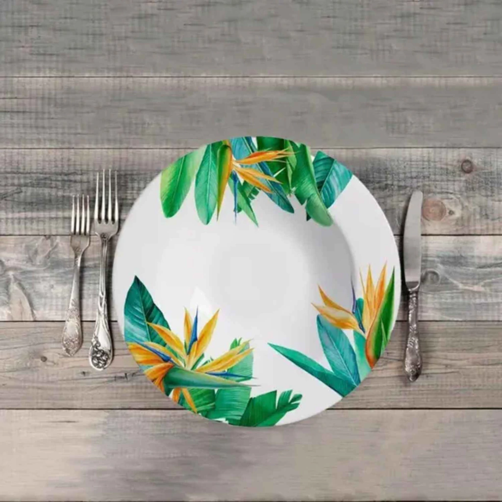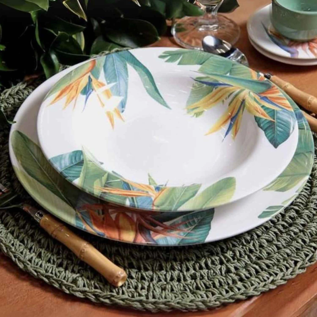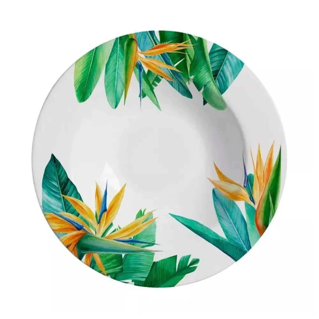 Com estampa inspirada na exuberância tropical da flor estrelítzia, este prato fundo da Alleanza combina beleza vibrante com sofisticação. Ideal para servir sopas, massas e pratos com molho, ele traz um toque de cor e elegância à mesa, valorizando composições criativas e cheias de personalidade.