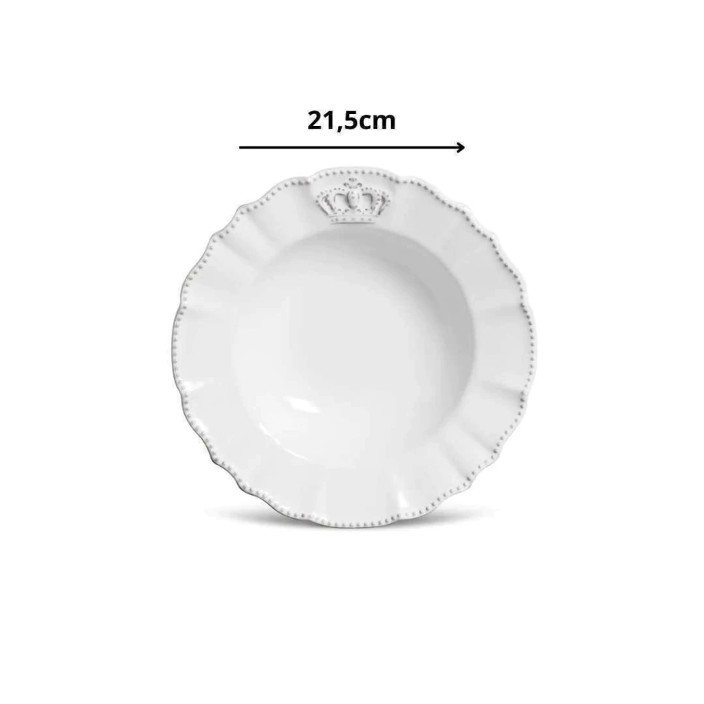 O Prato Fundo Windsor Coroa Porto Brasil apresenta um design clássico e refinado que combina elementos tradicionais com um toque contemporâneo. Destaca-se pelos detalhes delicados de uma coroa em relevo, que conferem um charme aristocrático à peça. Ideal para servir sopas, cremes, ensopados e outras preparações que demandam maior capacidade de líquidos ou ingredientes.