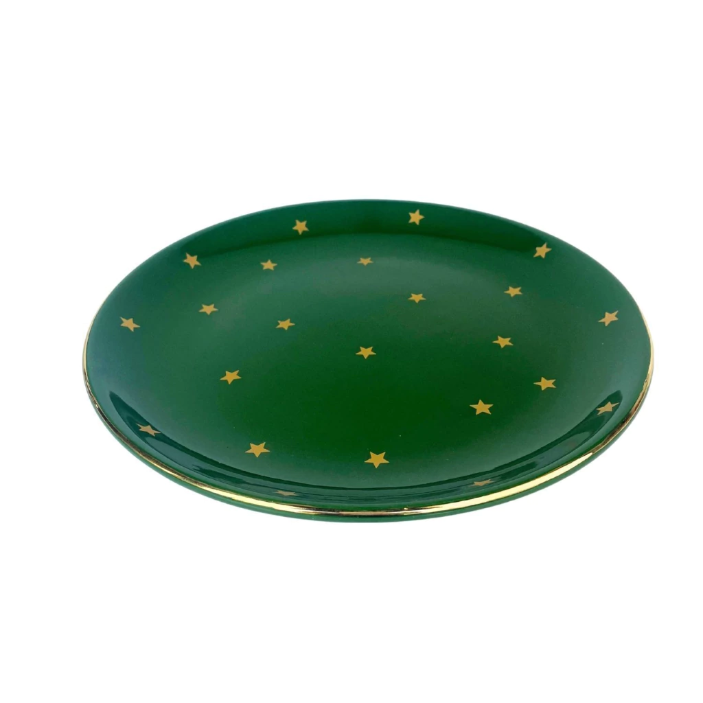 Kit composto por boleira e 4 pratinhos verdes com estrela dourada, perfeito para servir com charme e elegância. O conjunto traz um toque festivo e sofisticado à mesa. Ideal para compor momentos especiais e celebrações de fim de ano.