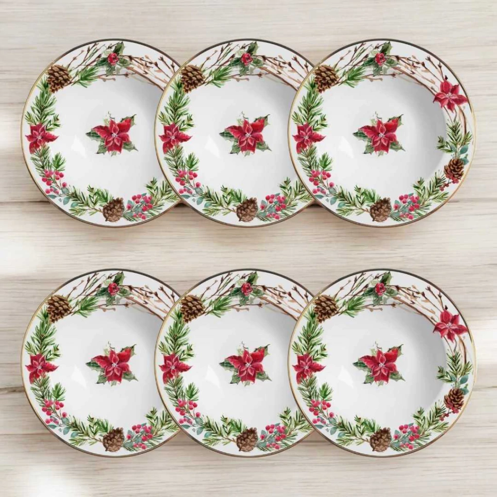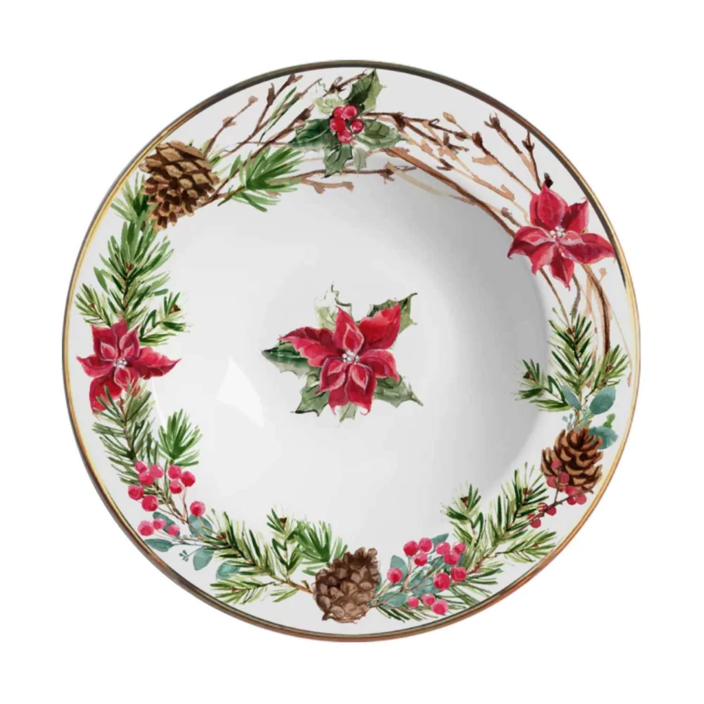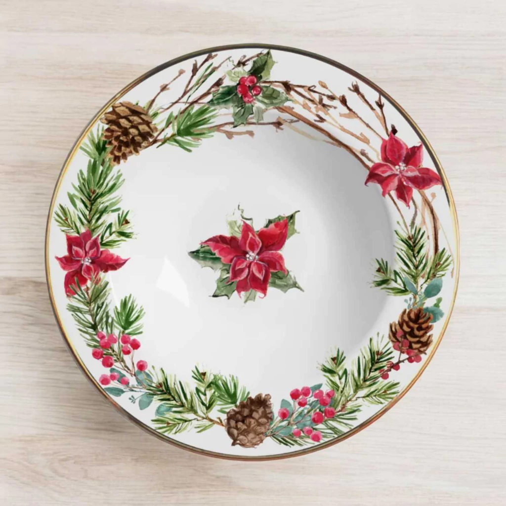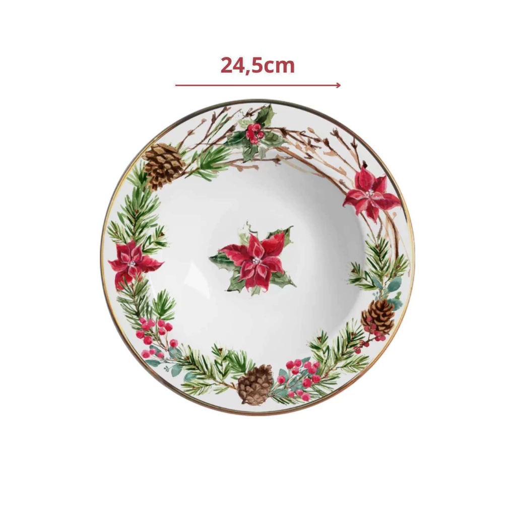 O prato fundo apresenta um design inspirado em guirlandas, que traz um toque festivo, ideal para compor mesas durante celebrações e festas. O delicado filete dourado adiciona um toque de glamour, elevando o visual e proporcionando sofisticação a qualquer refeição.