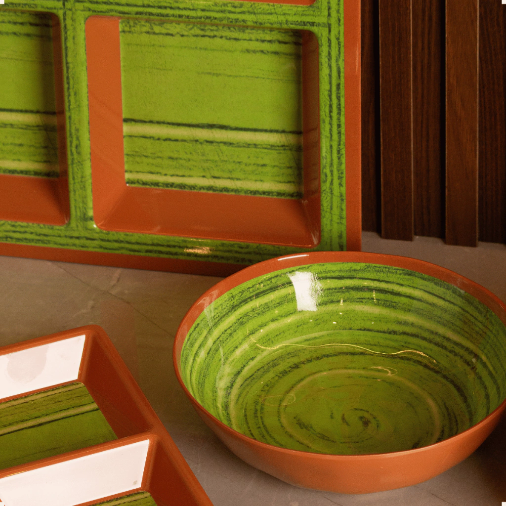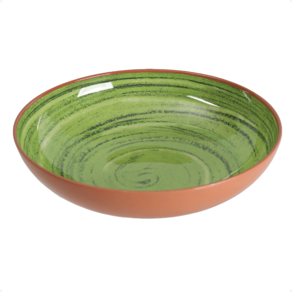 Interior esmaltado em verde vibrante que dá um toque rústico e moderno à mesa.