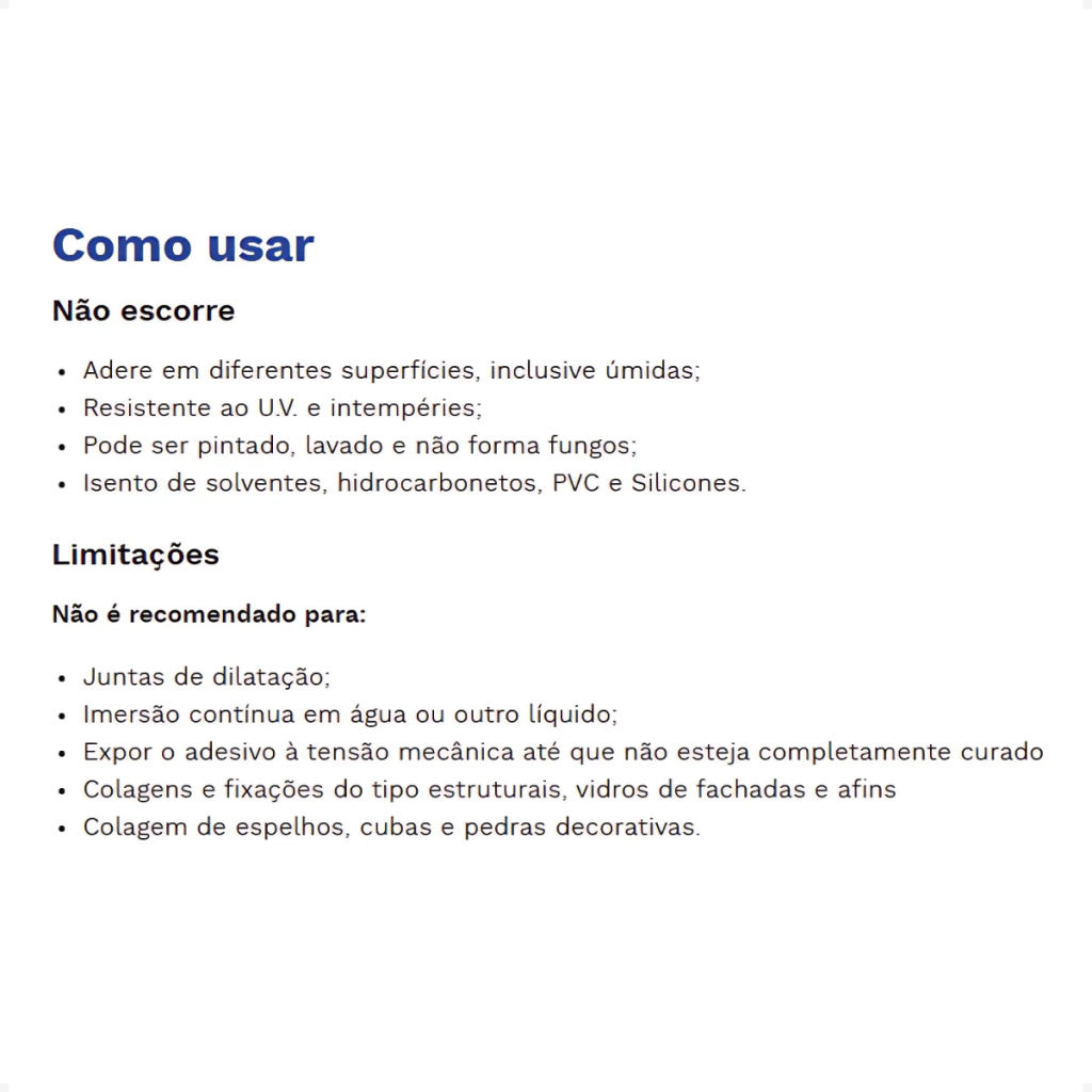 Adesivo flexível para diversas colagens e acabamentos na construção civil, adere no úmido e acompanha a movimentação. É resistente aos raios U.V. e variações climáticas, pode ser pintado e lavado após curado.