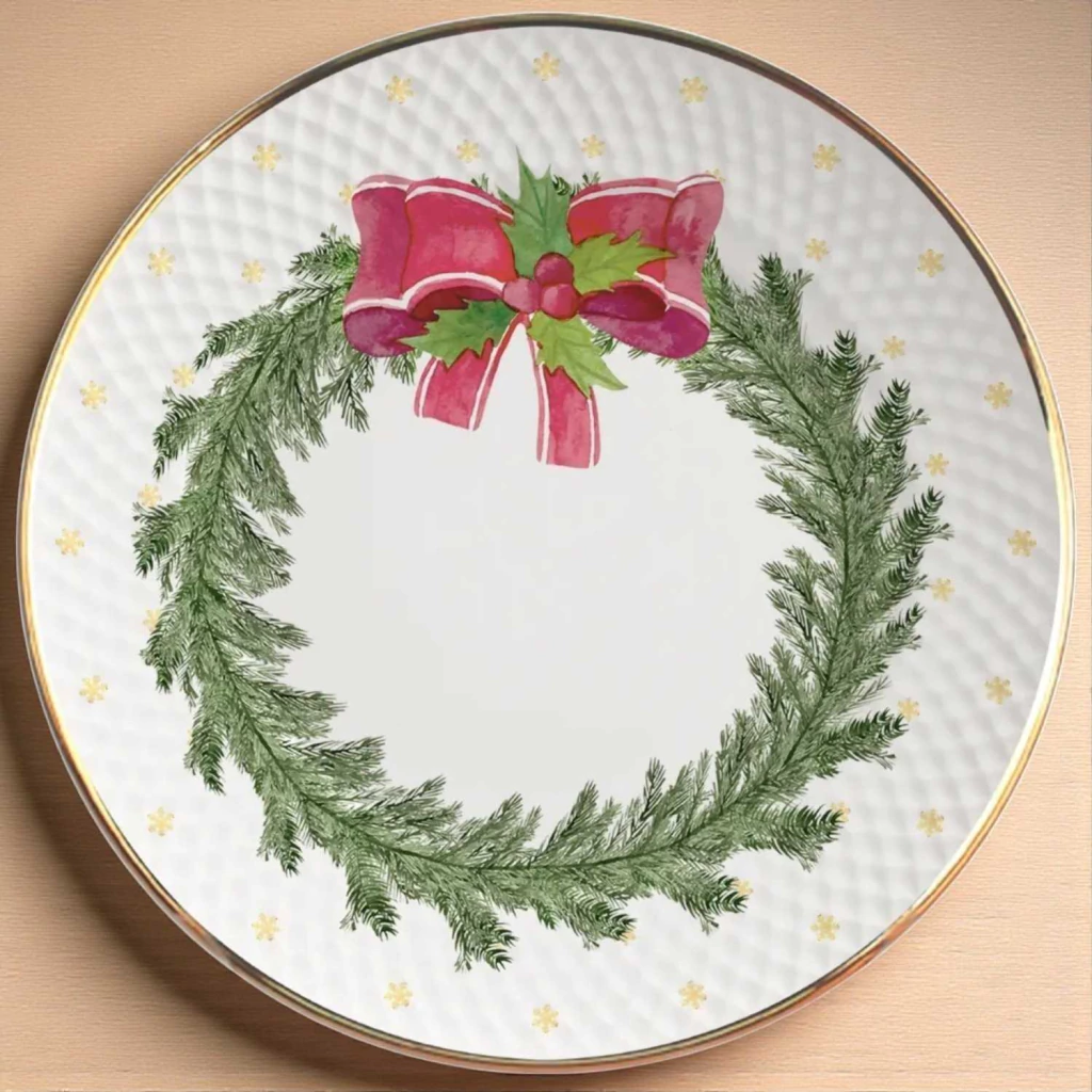 Sousplat branco sofisticado, adornado com um fino filete dourado e uma charmosa guirlanda natalina ao centro. Proporciona um toque festivo e elegante à mesa. Perfeito para valorizar suas louças e encantar nas celebrações de fim de ano.