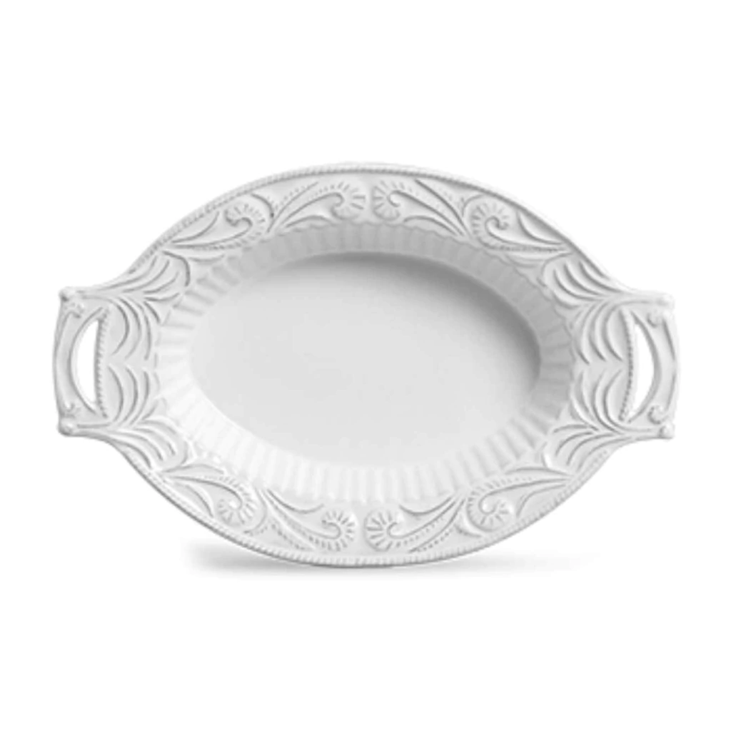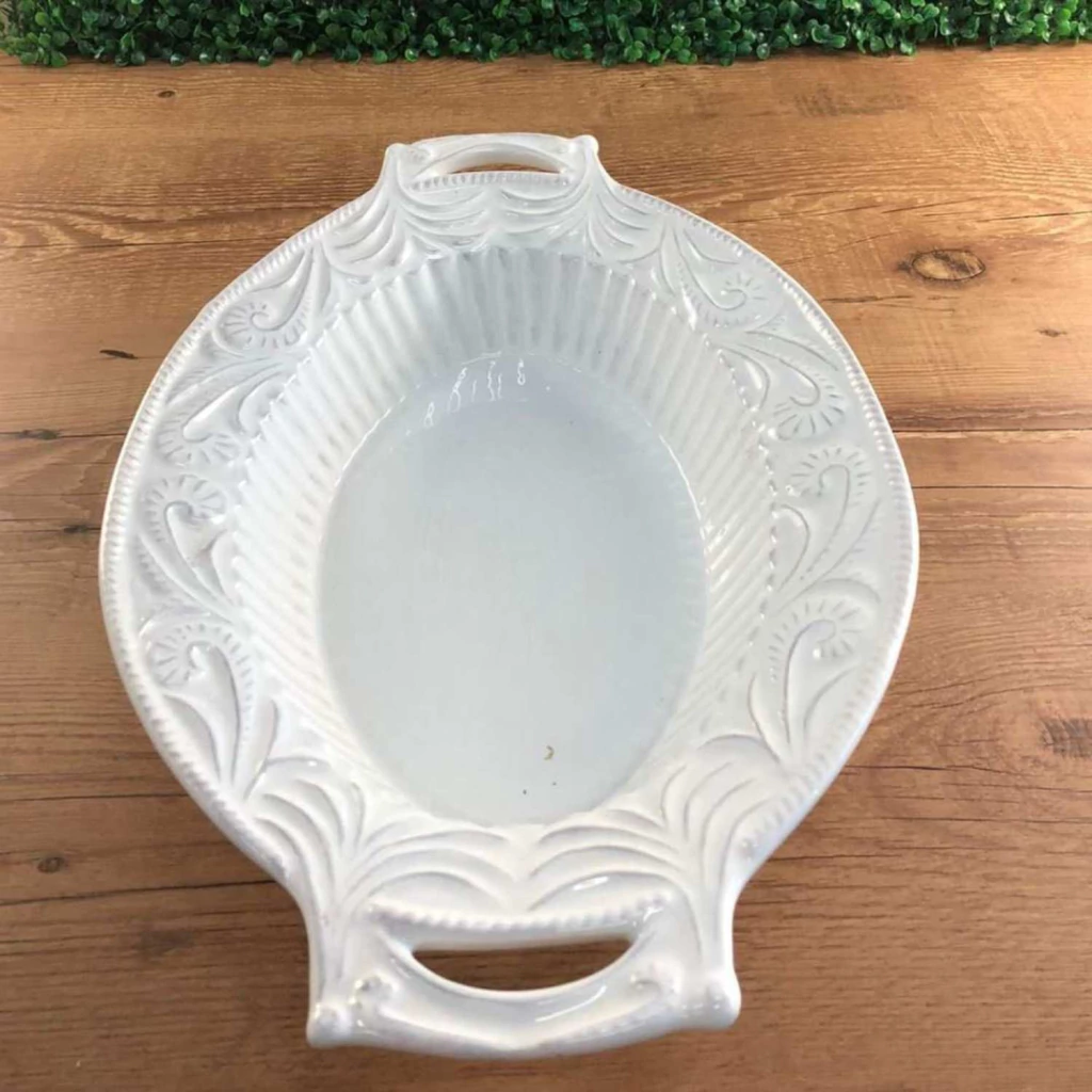 A Travessa Oval Funda Média Ravelo Provence Branca Scalla tem um estilo encantador e elegante, com detalhes que remetem à beleza da região da Provence.