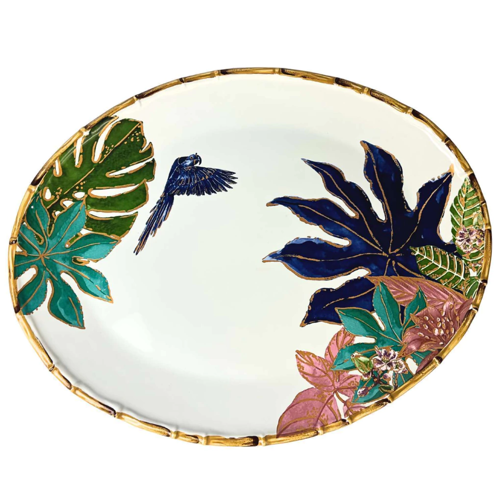 A Travessa Rasa Grande Bambu Arara Maison Blanche une a sofisticação do design contemporâneo ao charme do estilo tropical. Produzida em material resistente e de fácil limpeza, traz estampa de arara e elementos naturais que valorizam a mesa posta com cor e personalidade.