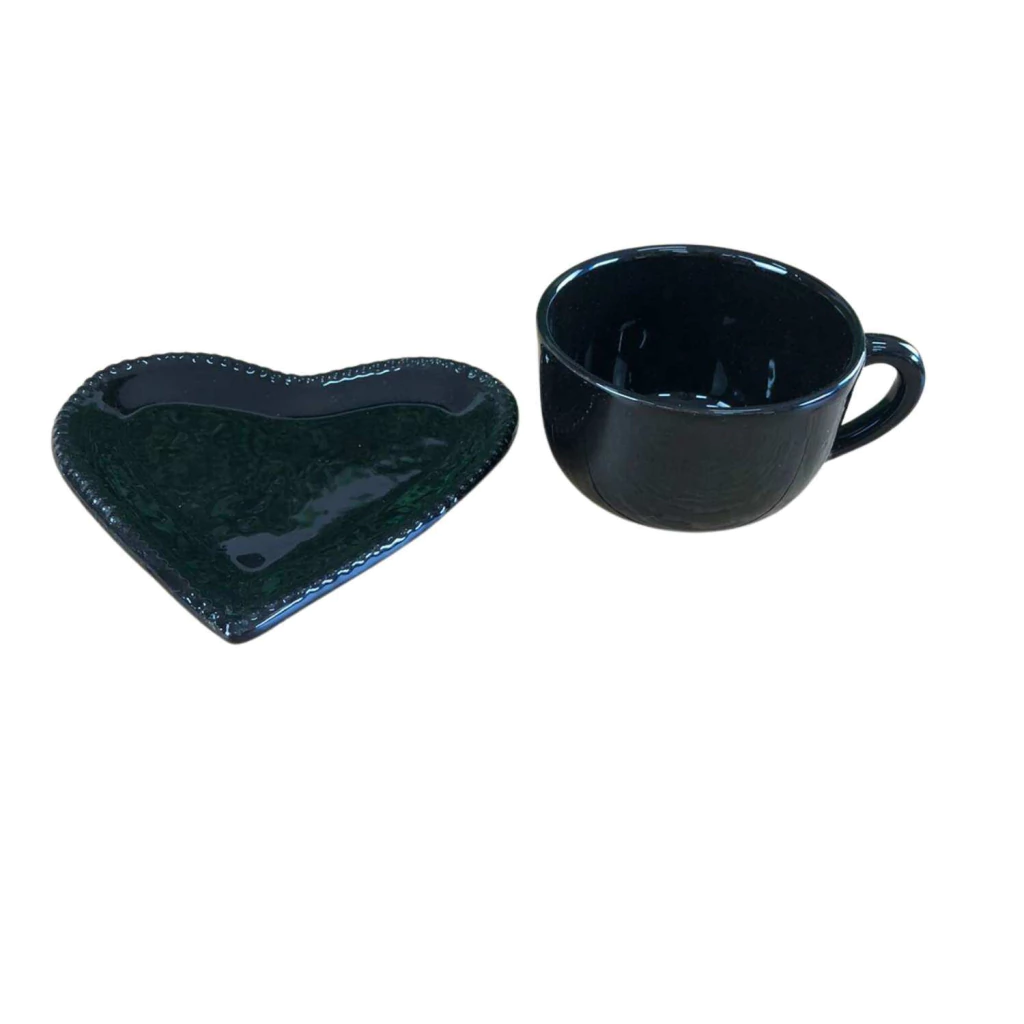 O pires em formato de coração não apenas complementa visualmente a xícara, mas também oferece uma base estável para colocá-la.